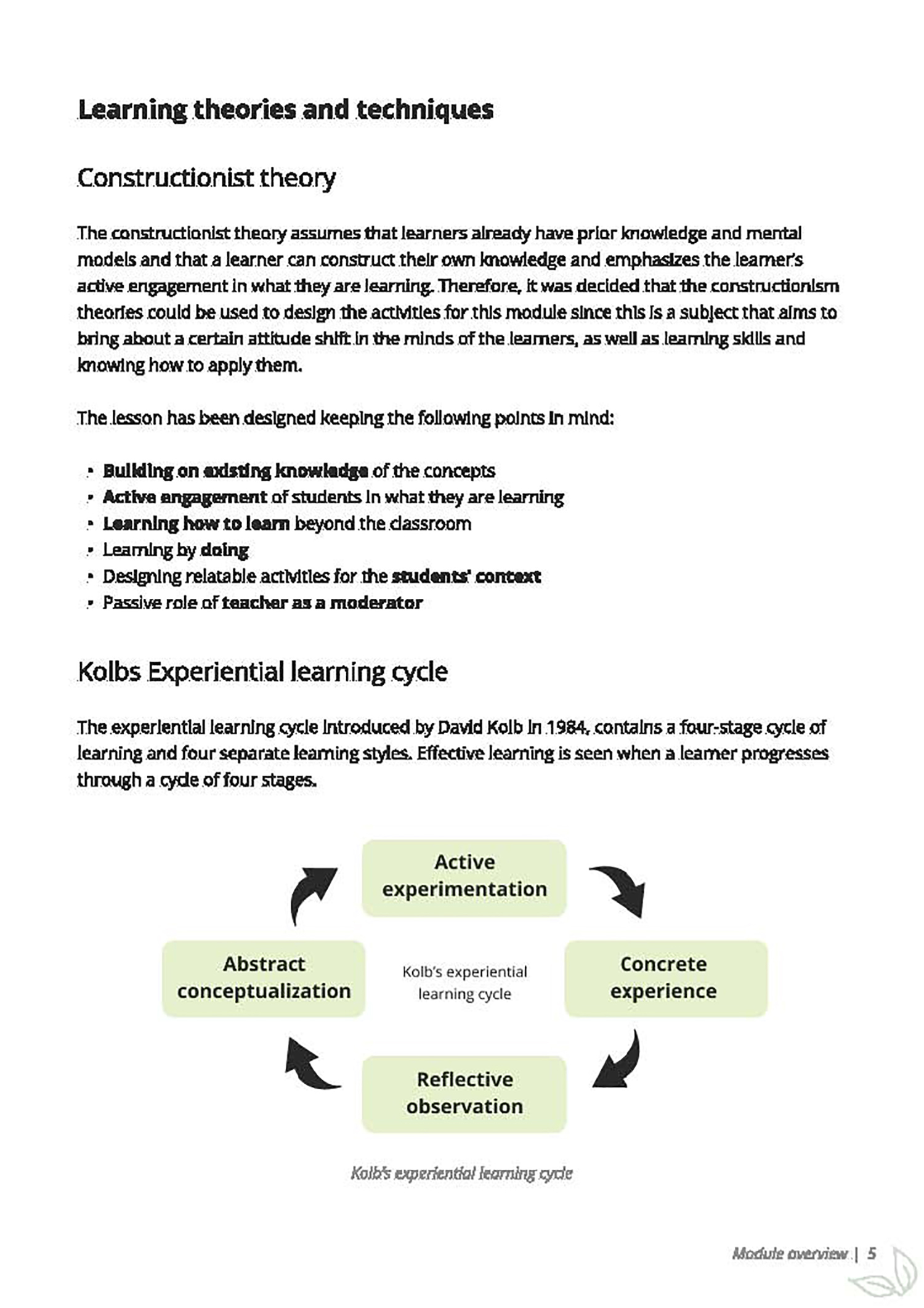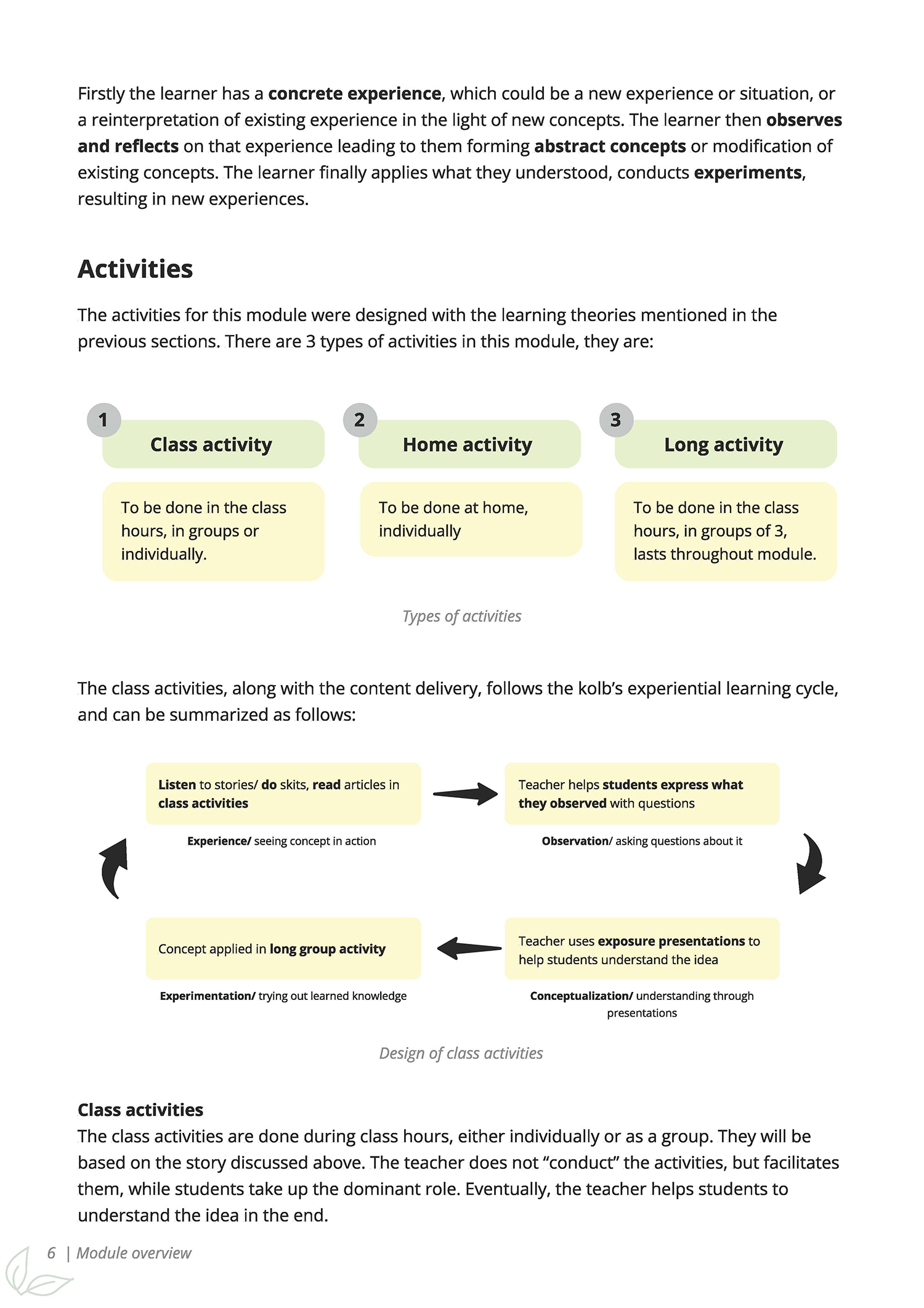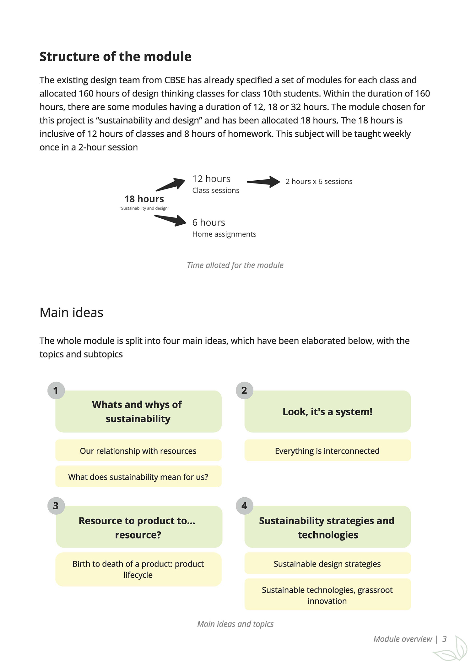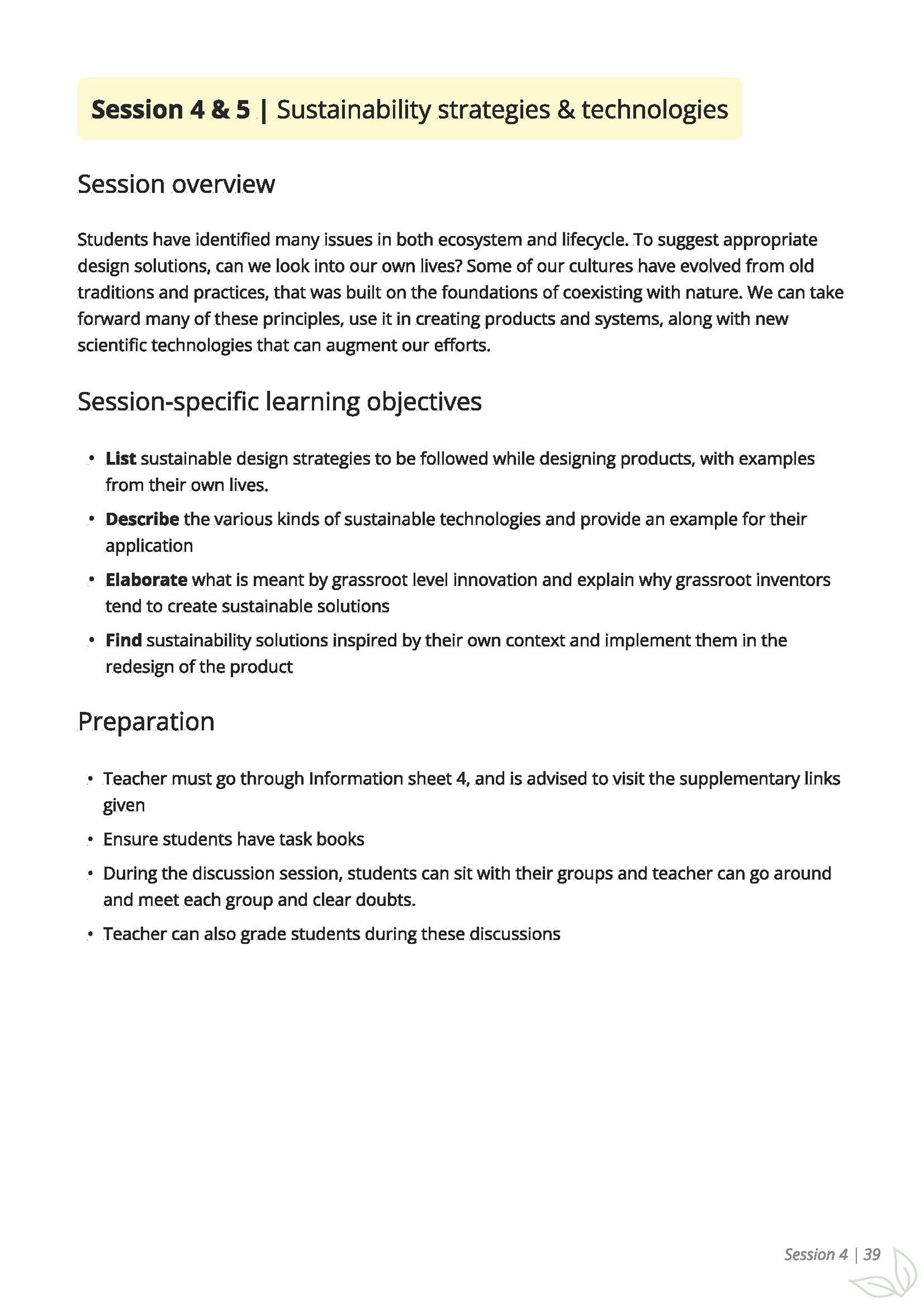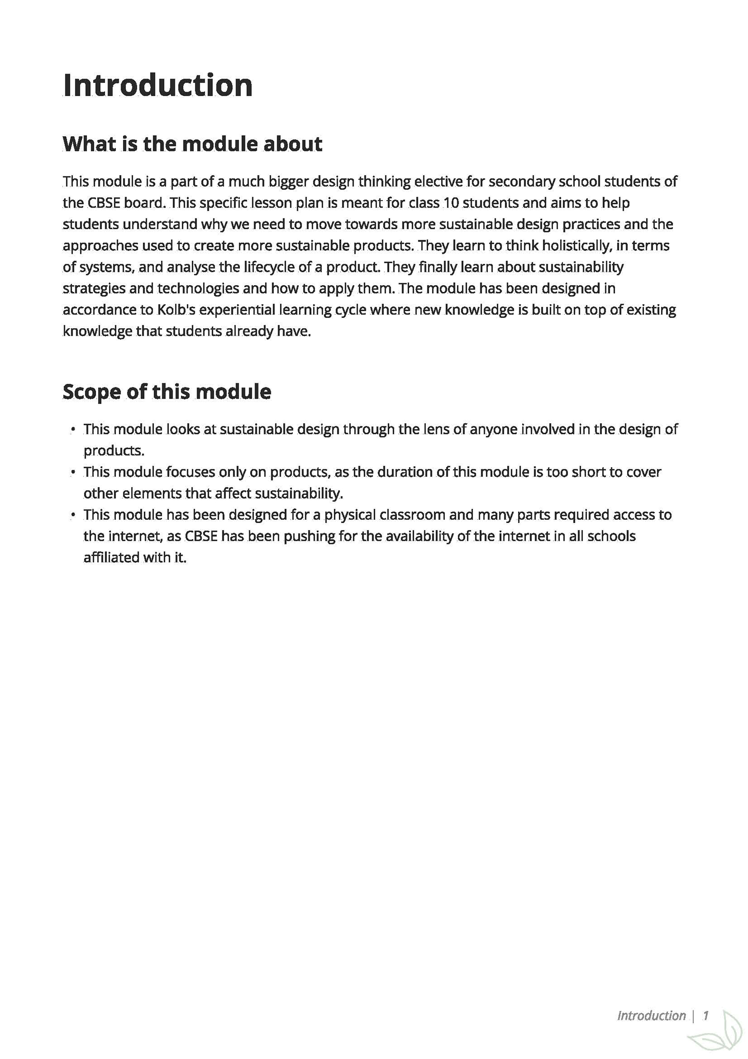 This module is a part of a much bigger design thinking elective for secondary school students of the CBSE board. This specific lesson plan is meant for class 10 students and aims to help students understand why we need to move towards more sustainable design practices and the approaches used to create more sustainable products. They learn to think holistically, in terms of systems, and analyse the lifecycle of a product. They finally learn about sustainability strategies and technologies and how to apply them. The module has been designed in accordance to Kolb's experiential learning cycle where new knowledge is built on top of existing knowledge that students already have.