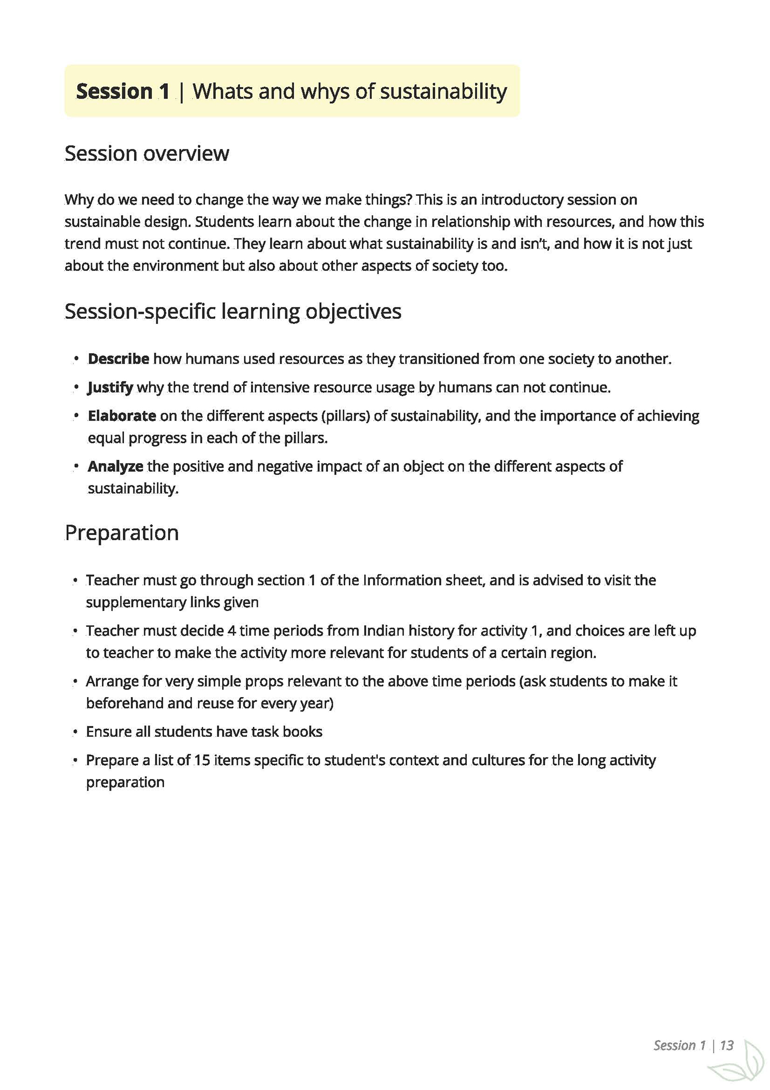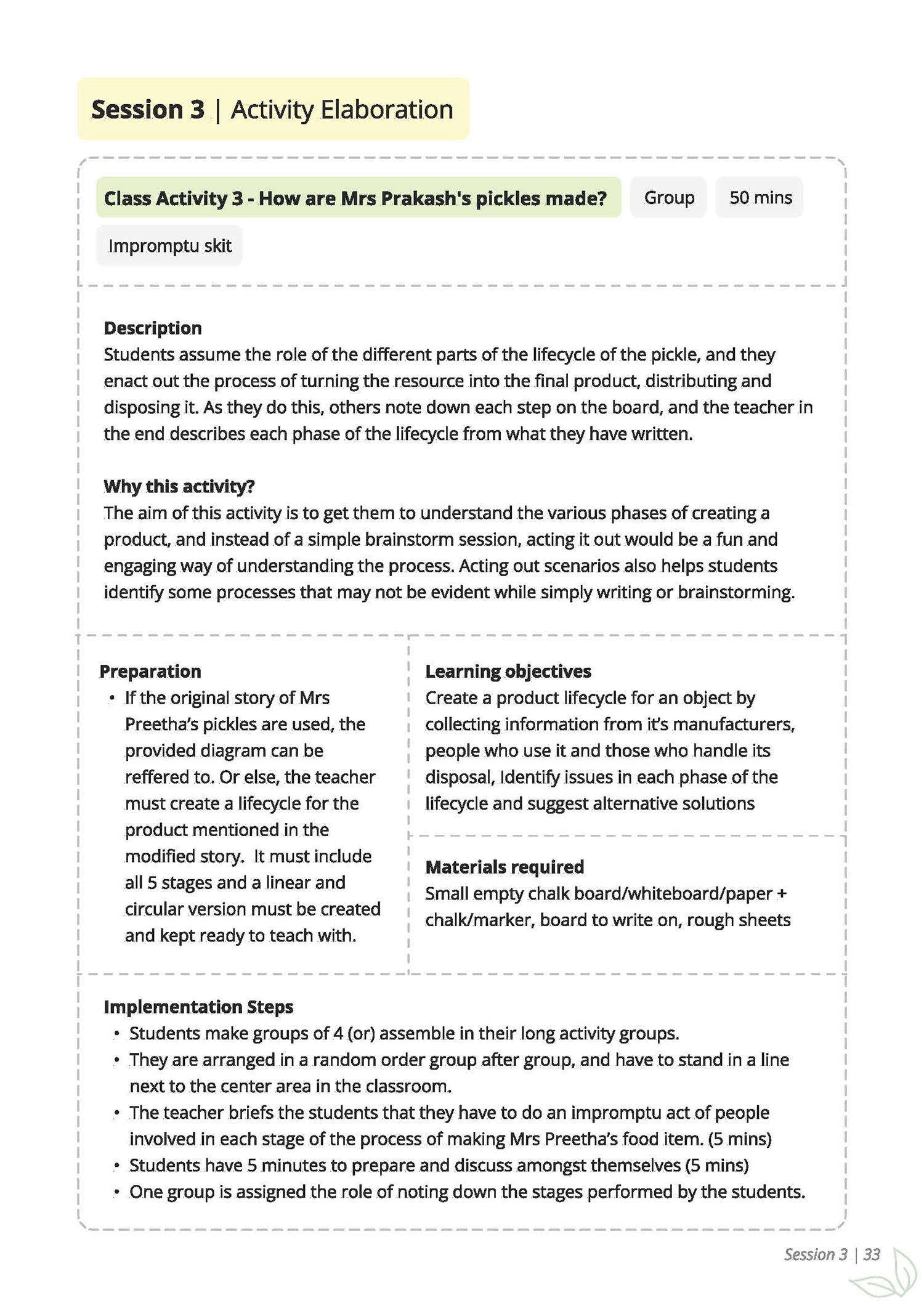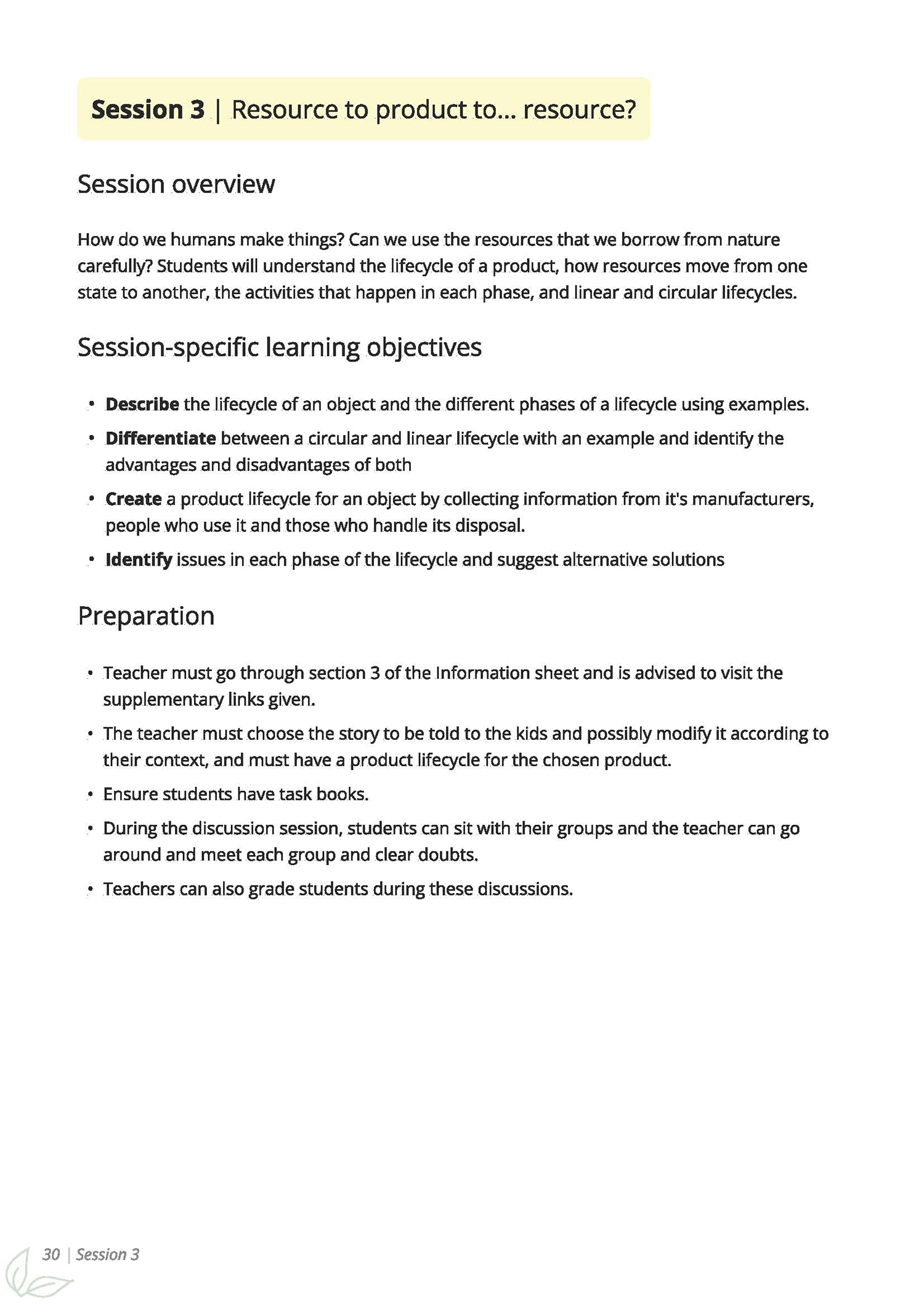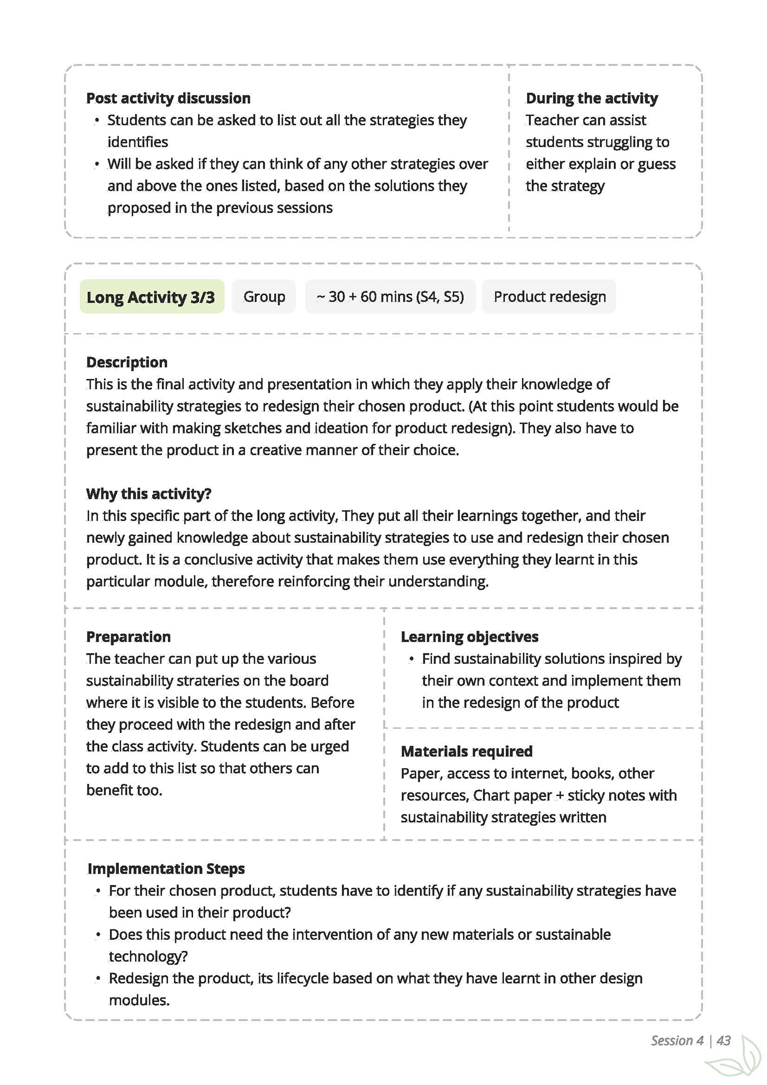 This module is a part of a much bigger design thinking elective for secondary school students of the CBSE board. This specific lesson plan is meant for class 10 students and aims to help students understand why we need to move towards more sustainable design practices and the approaches used to create more sustainable products. They learn to think holistically, in terms of systems, and analyse the lifecycle of a product. They finally learn about sustainability strategies and technologies and how to apply them. The module has been designed in accordance to Kolb's experiential learning cycle where new knowledge is built on top of existing knowledge that students already have.