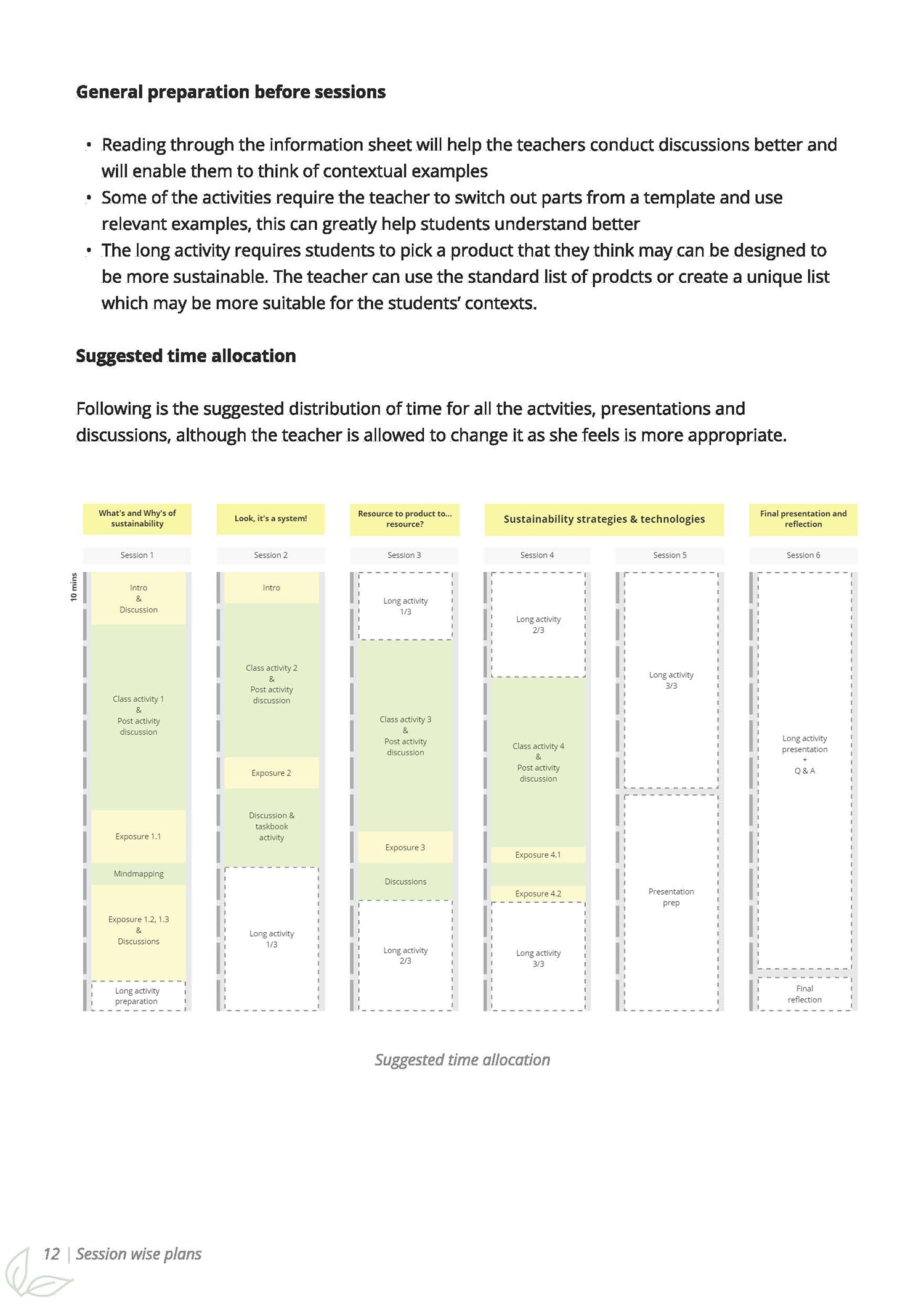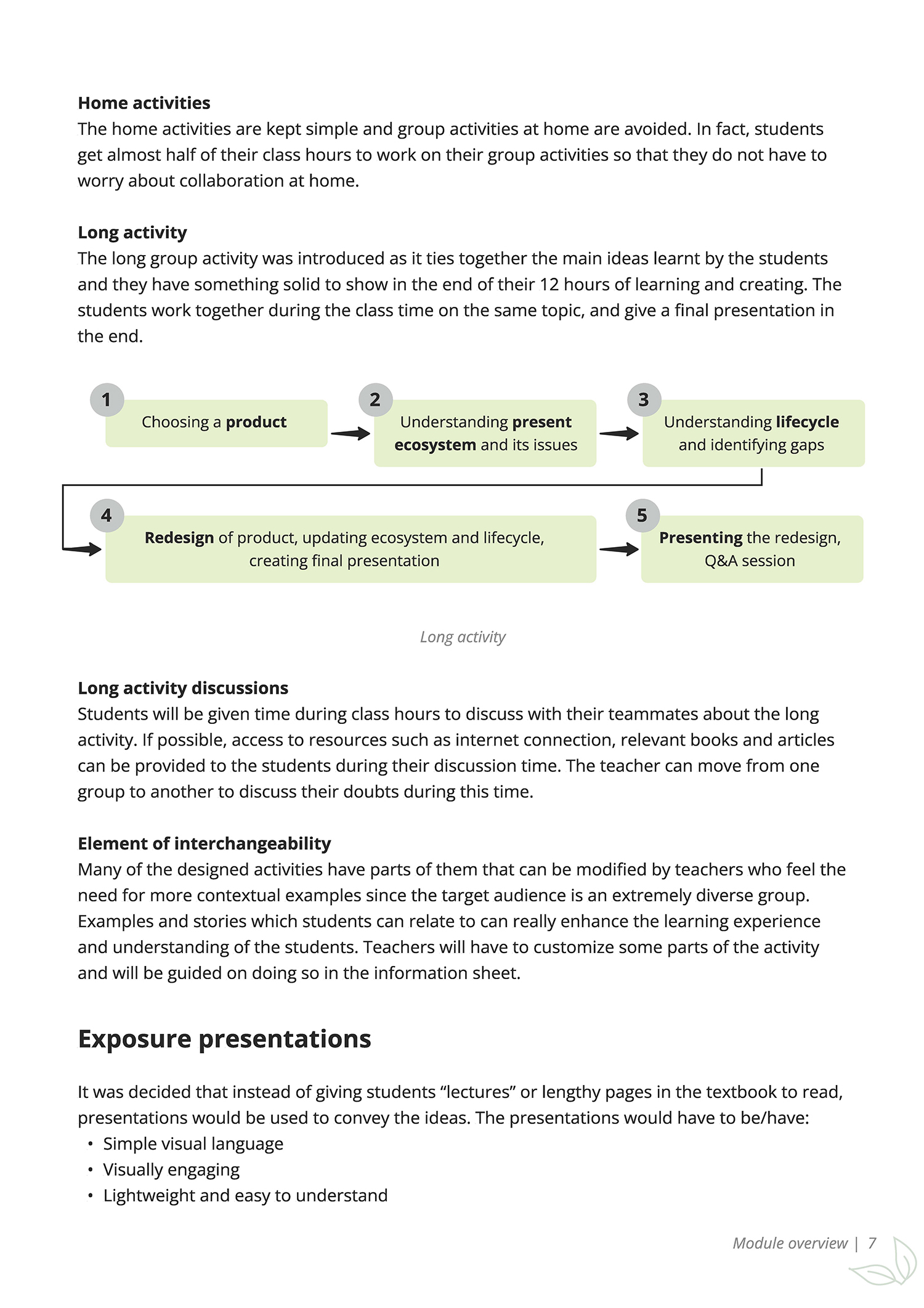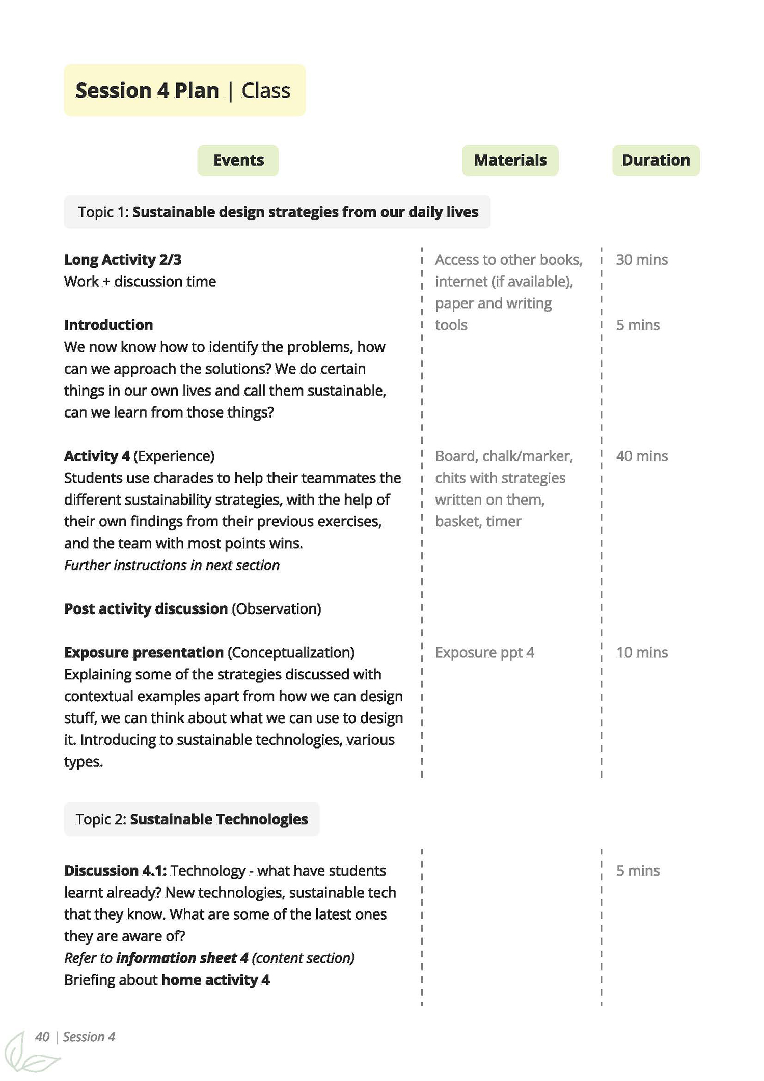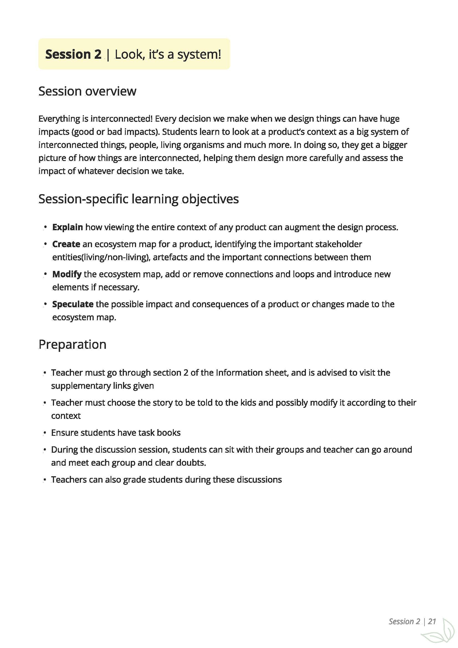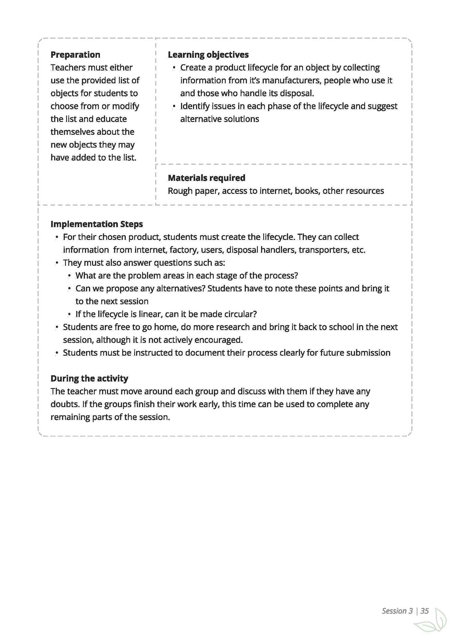 This module is a part of a much bigger design thinking elective for secondary school students of the CBSE board. This specific lesson plan is meant for class 10 students and aims to help students understand why we need to move towards more sustainable design practices and the approaches used to create more sustainable products. They learn to think holistically, in terms of systems, and analyse the lifecycle of a product. They finally learn about sustainability strategies and technologies and how to apply them. The module has been designed in accordance to Kolb's experiential learning cycle where new knowledge is built on top of existing knowledge that students already have.