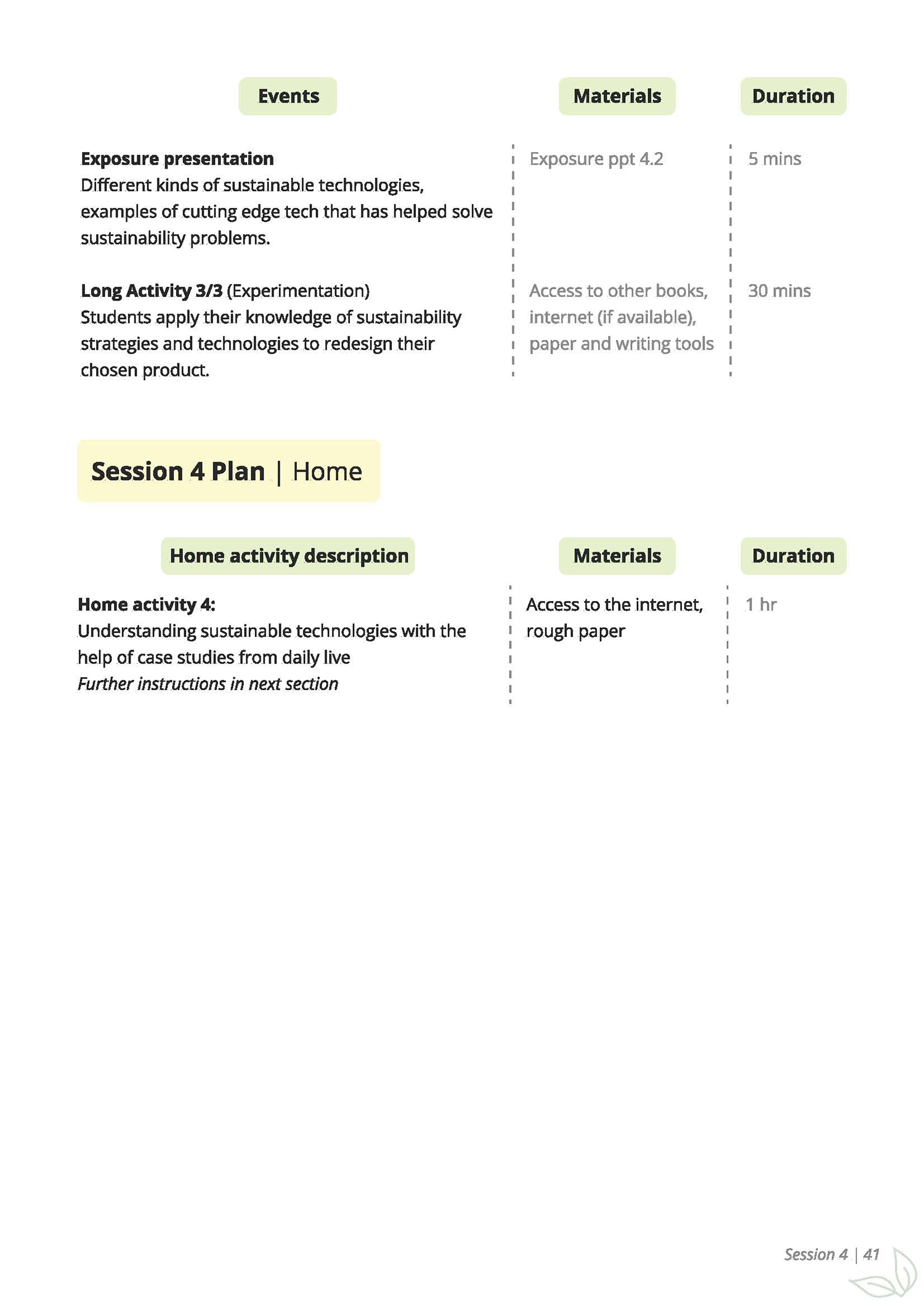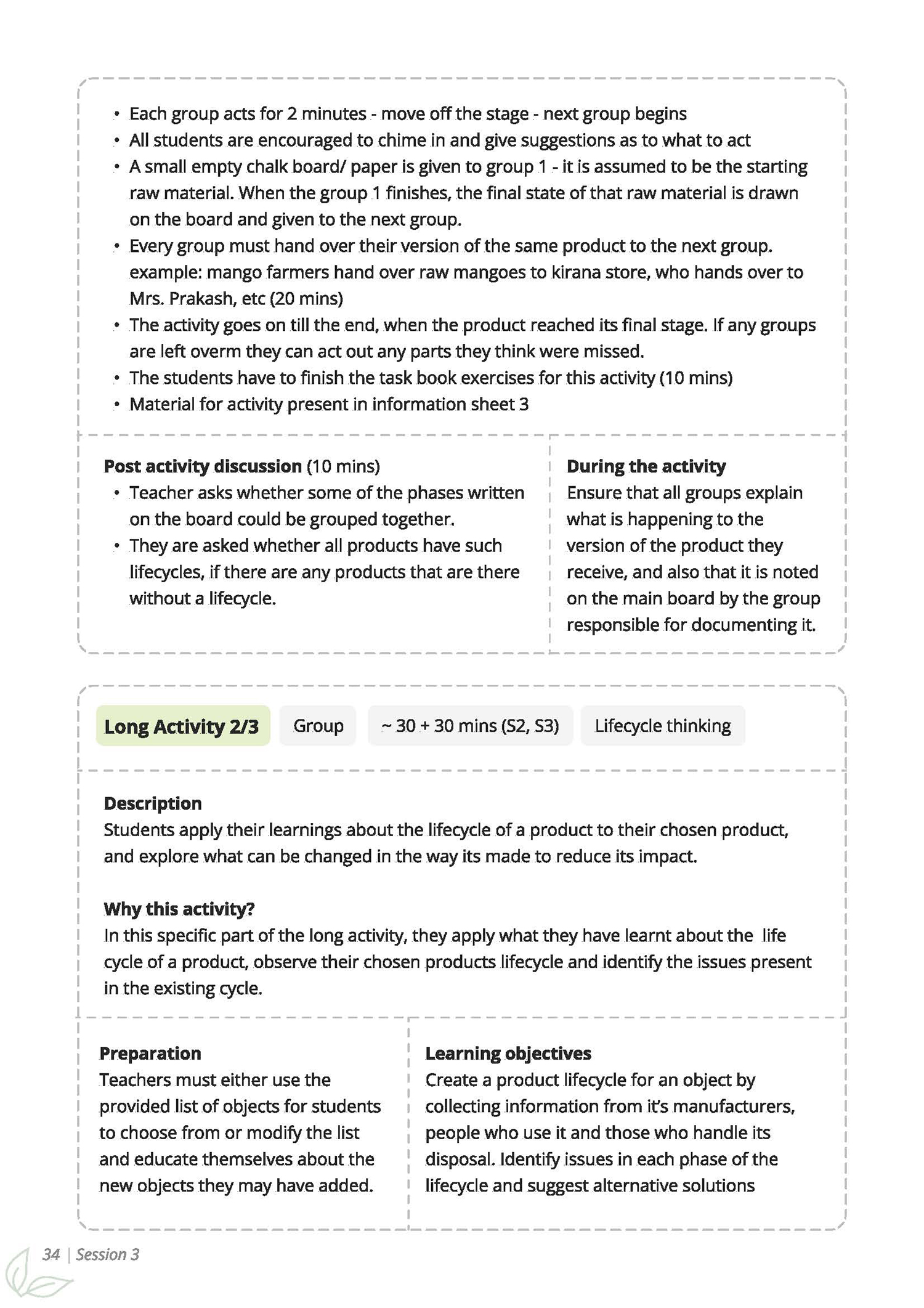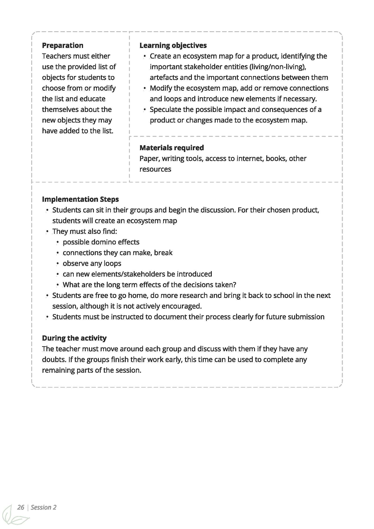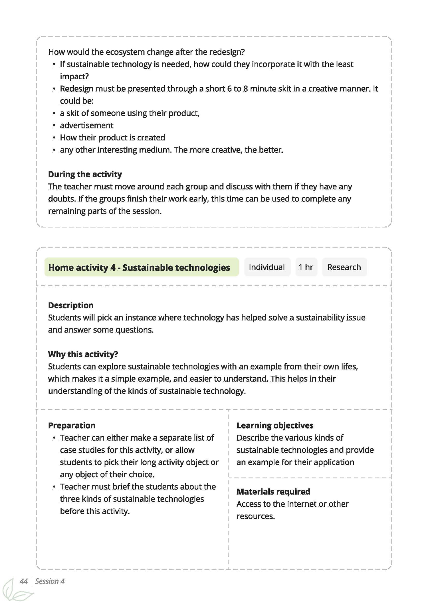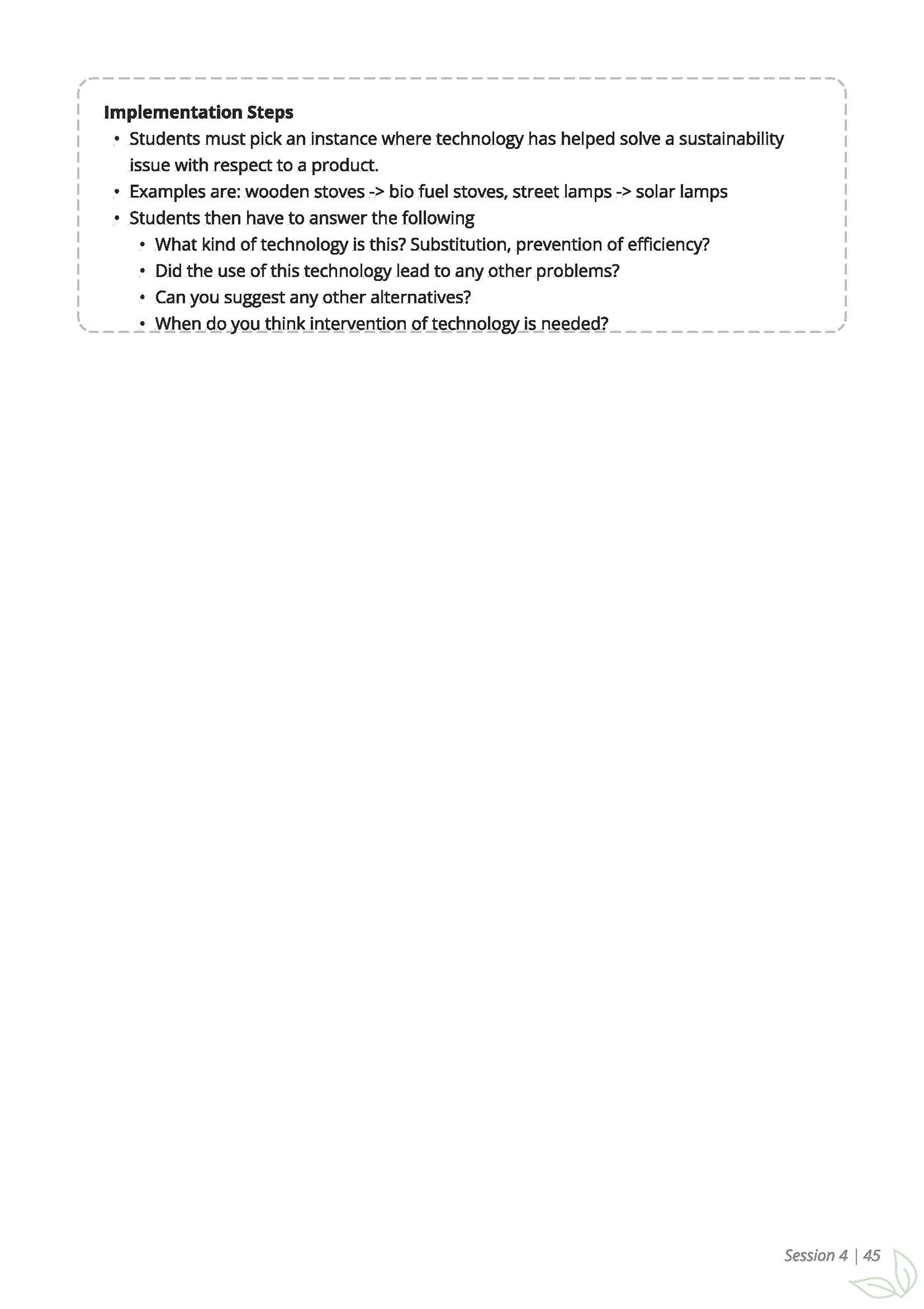 This module is a part of a much bigger design thinking elective for secondary school students of the CBSE board. This specific lesson plan is meant for class 10 students and aims to help students understand why we need to move towards more sustainable design practices and the approaches used to create more sustainable products. They learn to think holistically, in terms of systems, and analyse the lifecycle of a product. They finally learn about sustainability strategies and technologies and how to apply them. The module has been designed in accordance to Kolb's experiential learning cycle where new knowledge is built on top of existing knowledge that students already have.
