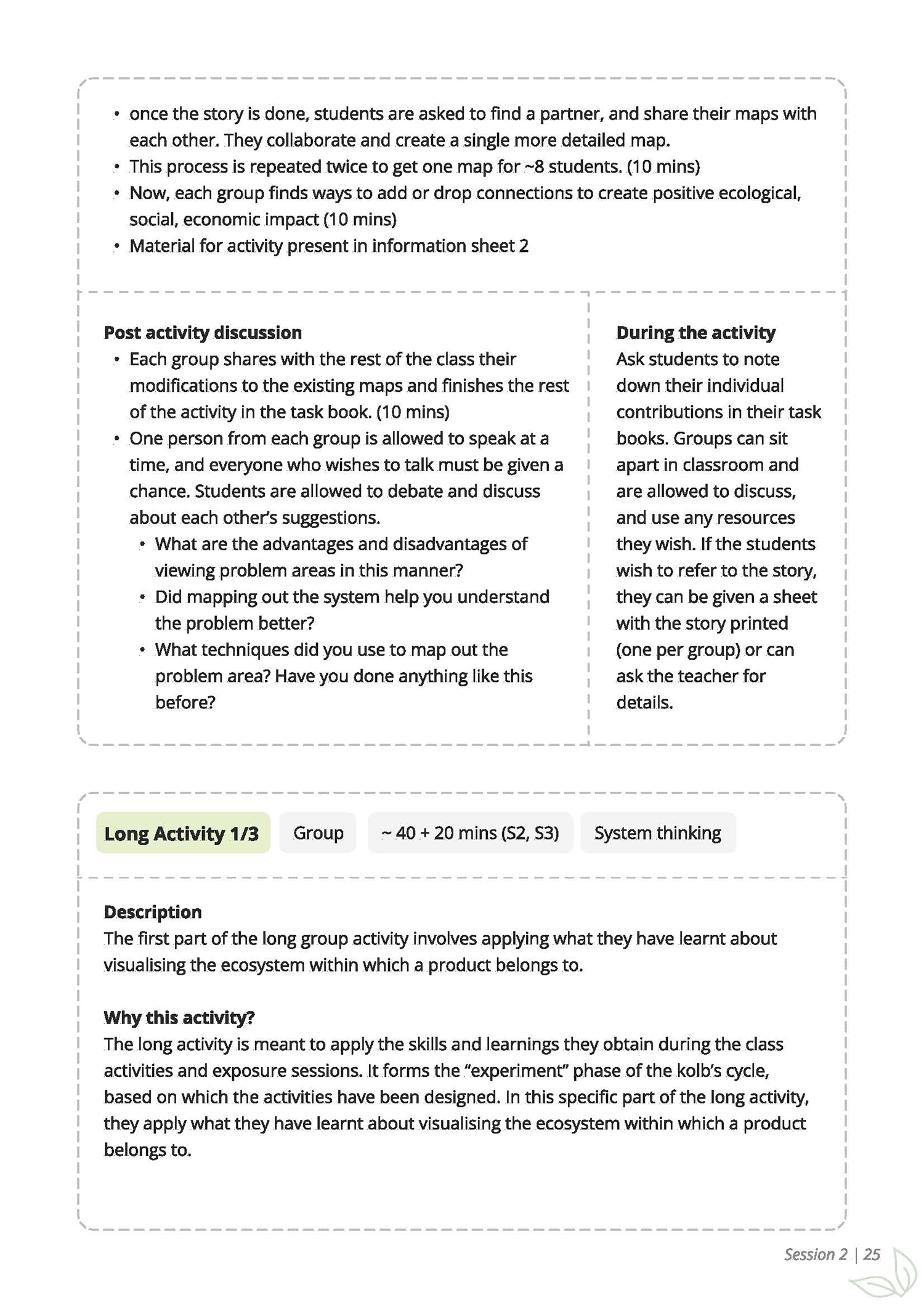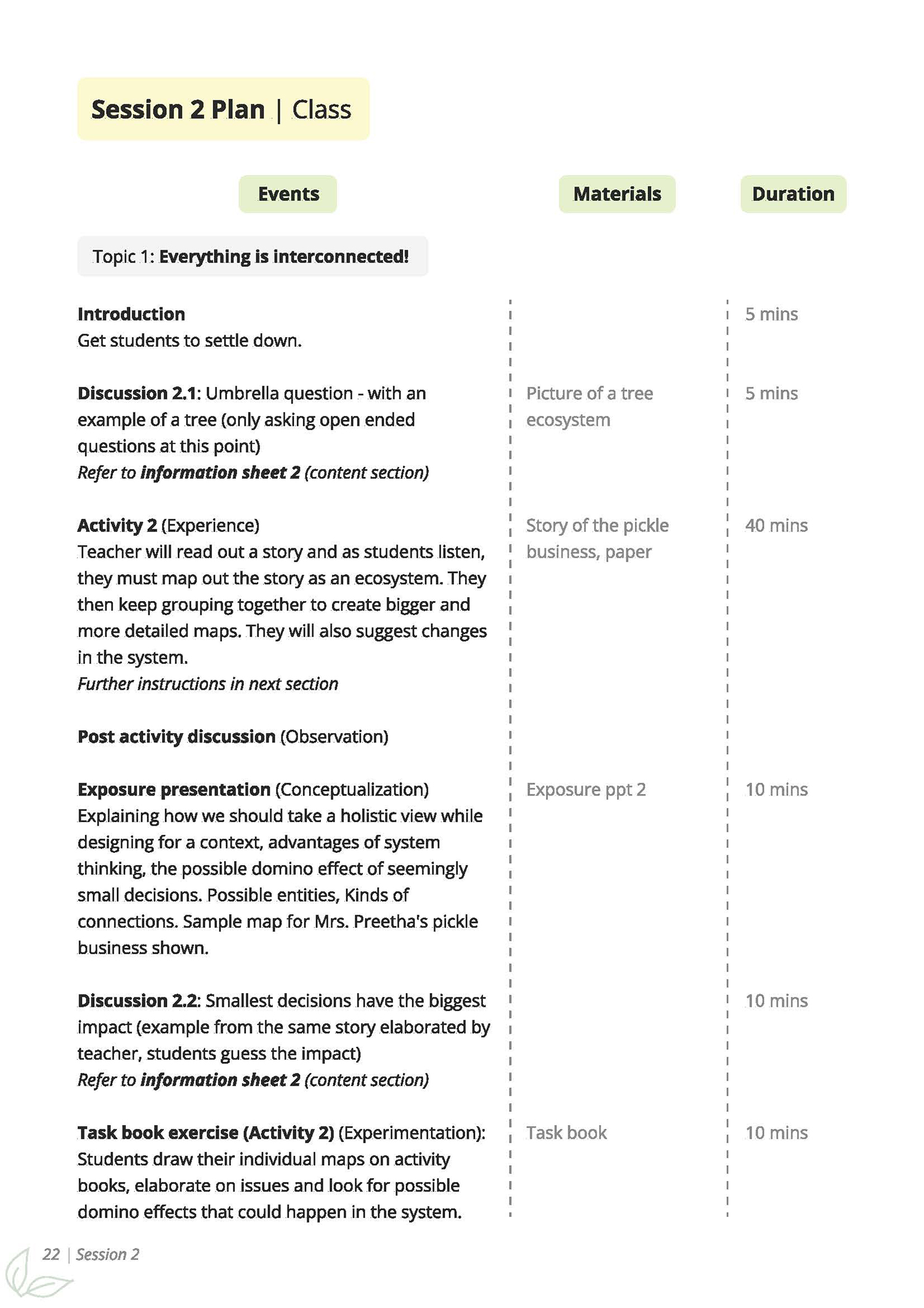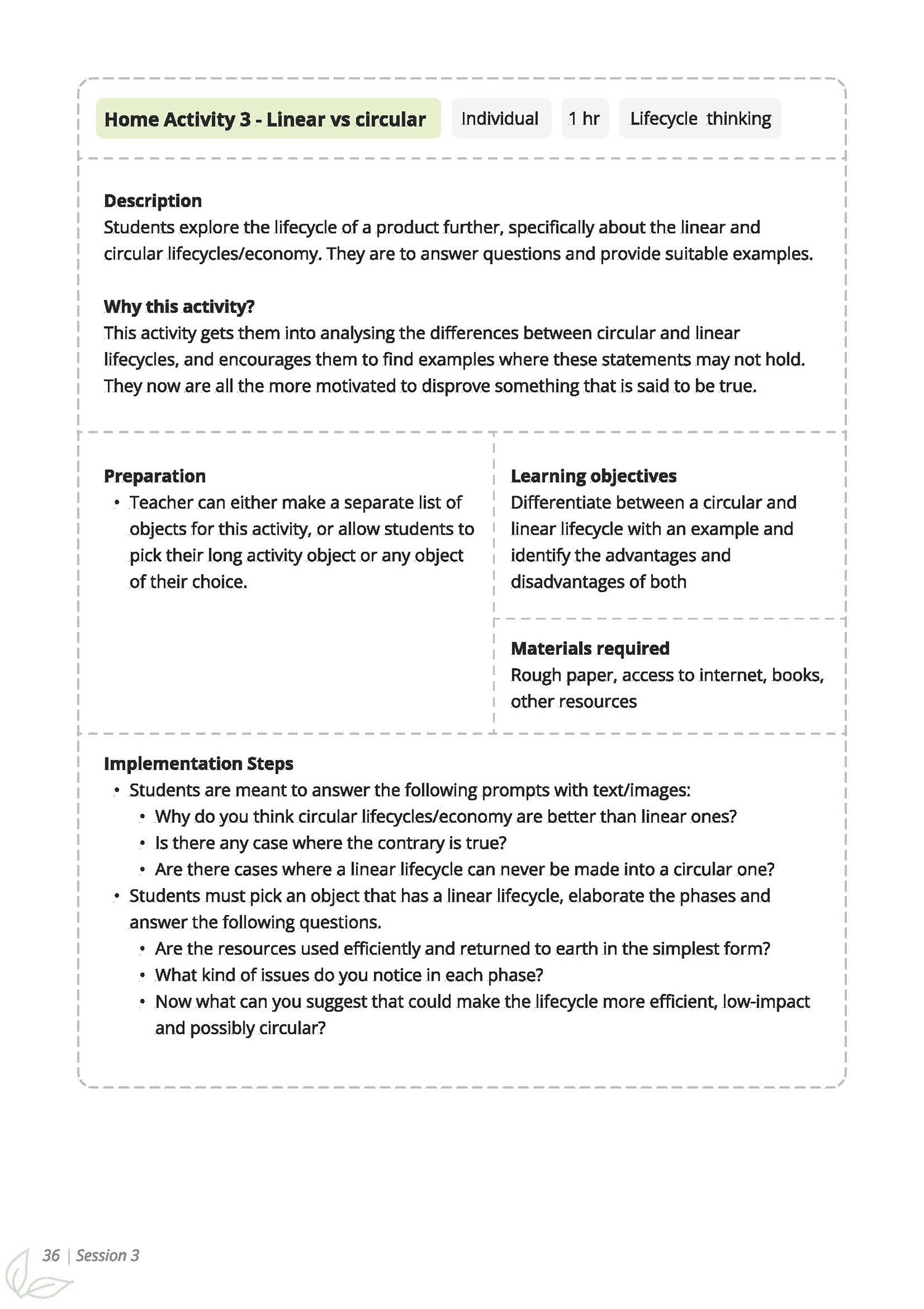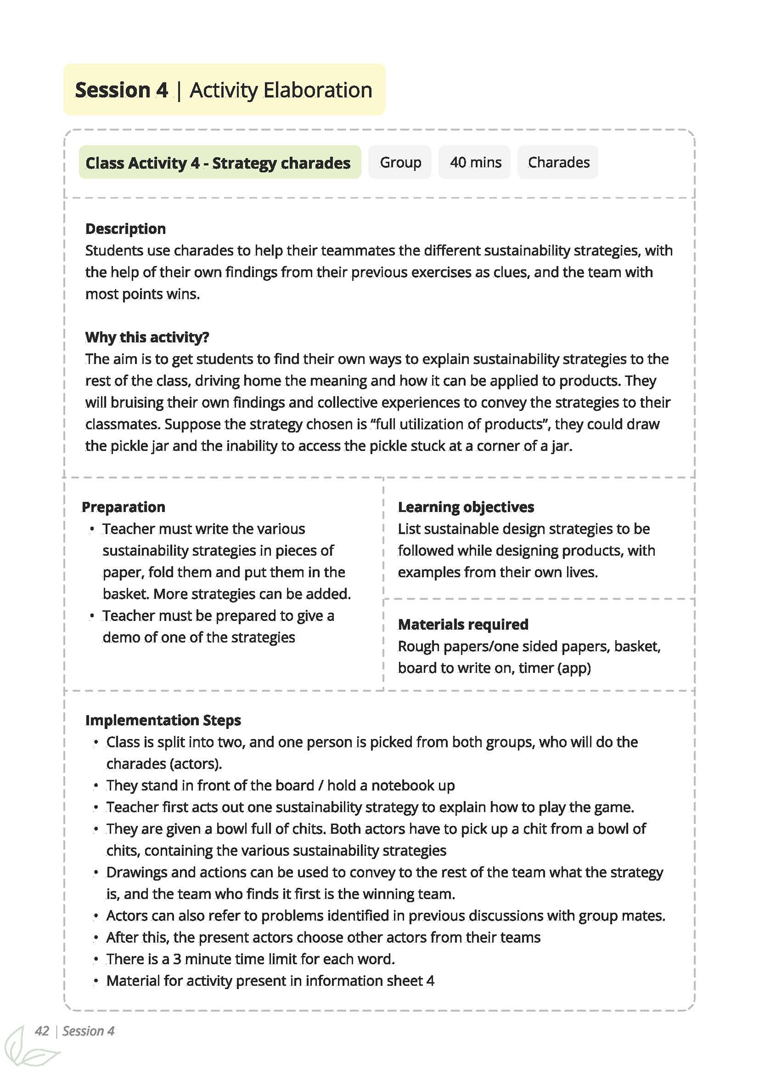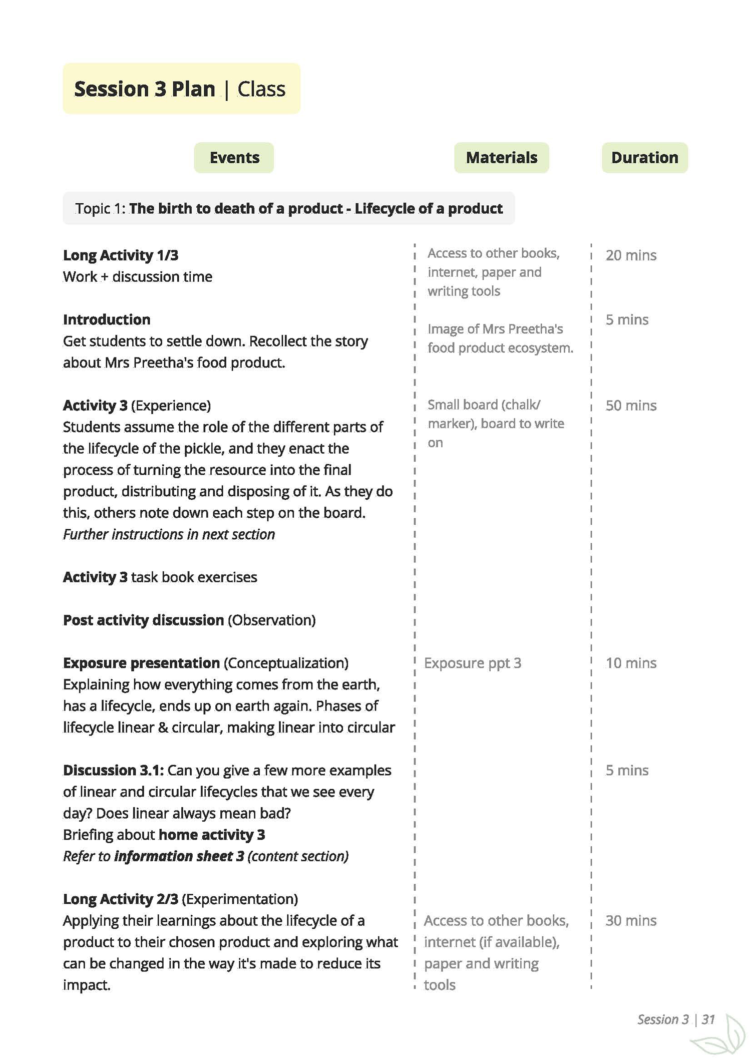 This module is a part of a much bigger design thinking elective for secondary school students of the CBSE board. This specific lesson plan is meant for class 10 students and aims to help students understand why we need to move towards more sustainable design practices and the approaches used to create more sustainable products. They learn to think holistically, in terms of systems, and analyse the lifecycle of a product. They finally learn about sustainability strategies and technologies and how to apply them. The module has been designed in accordance to Kolb's experiential learning cycle where new knowledge is built on top of existing knowledge that students already have.