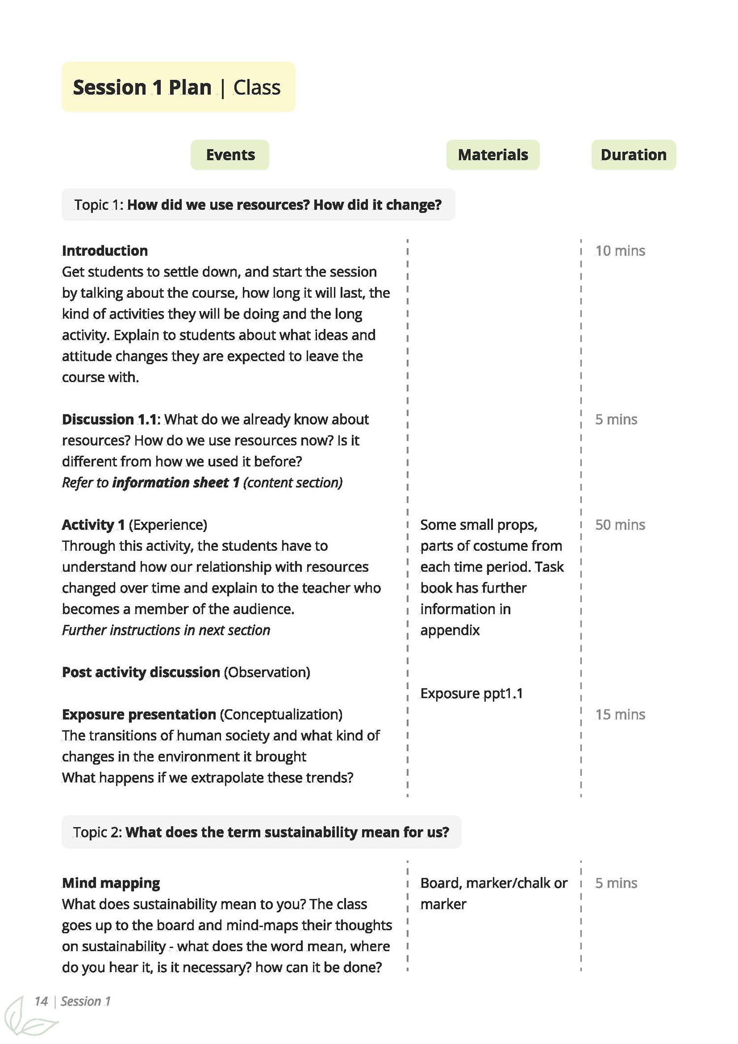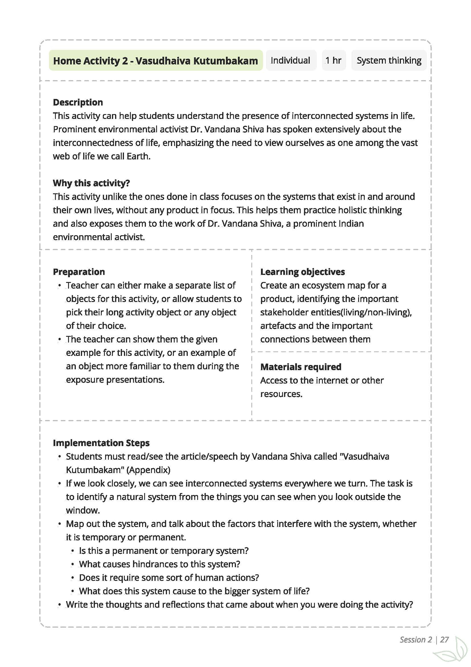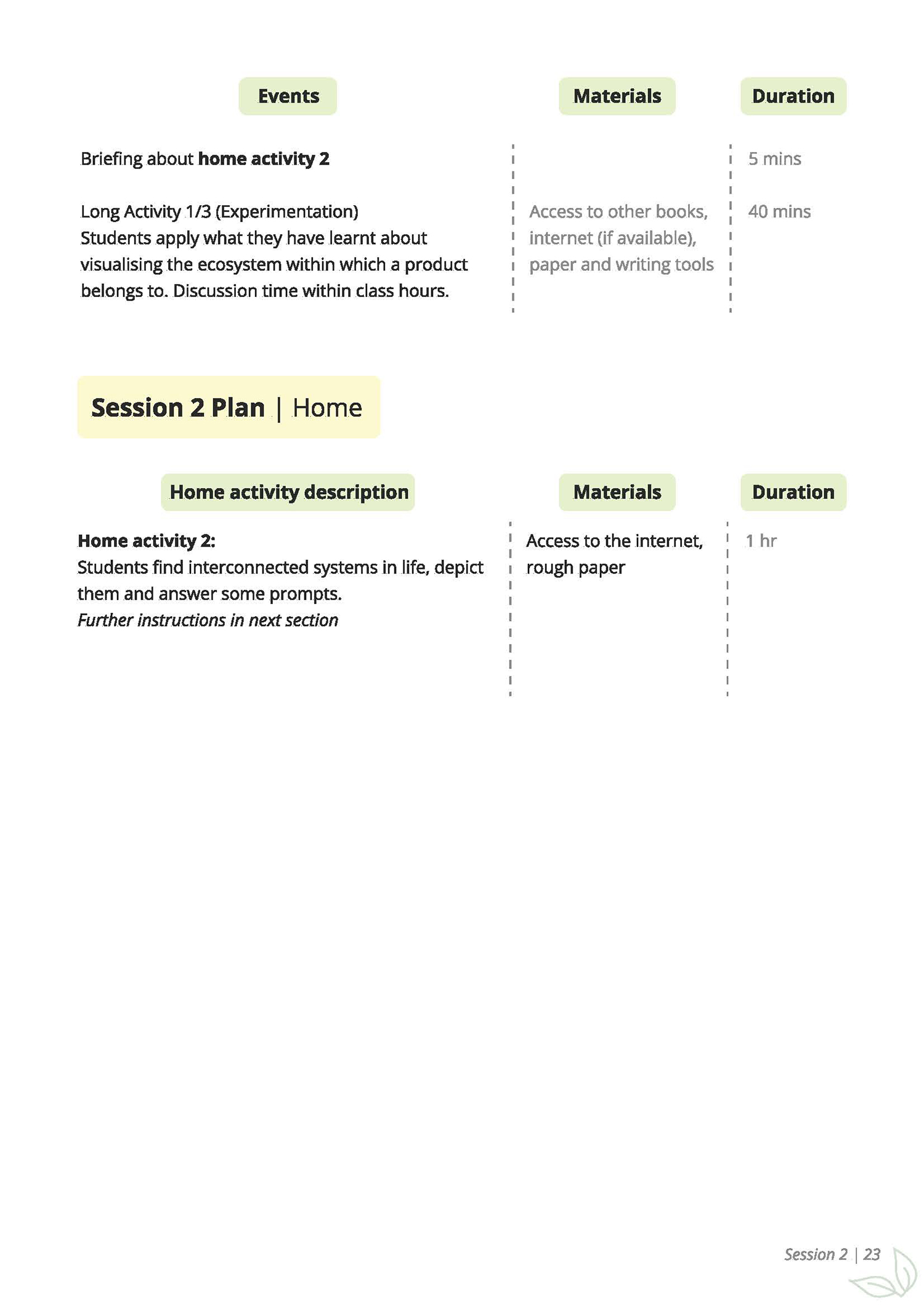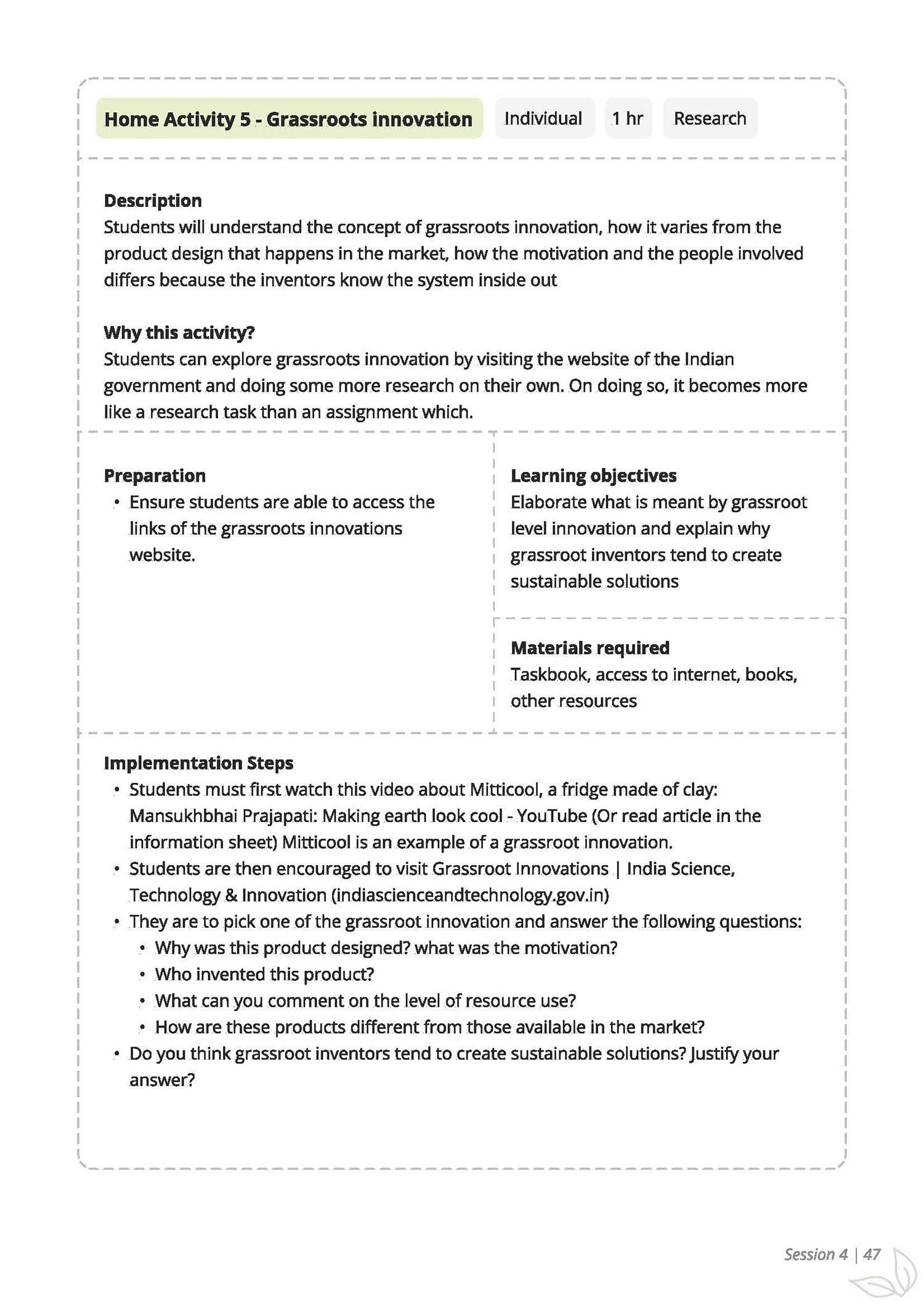 This module is a part of a much bigger design thinking elective for secondary school students of the CBSE board. This specific lesson plan is meant for class 10 students and aims to help students understand why we need to move towards more sustainable design practices and the approaches used to create more sustainable products. They learn to think holistically, in terms of systems, and analyse the lifecycle of a product. They finally learn about sustainability strategies and technologies and how to apply them. The module has been designed in accordance to Kolb's experiential learning cycle where new knowledge is built on top of existing knowledge that students already have.