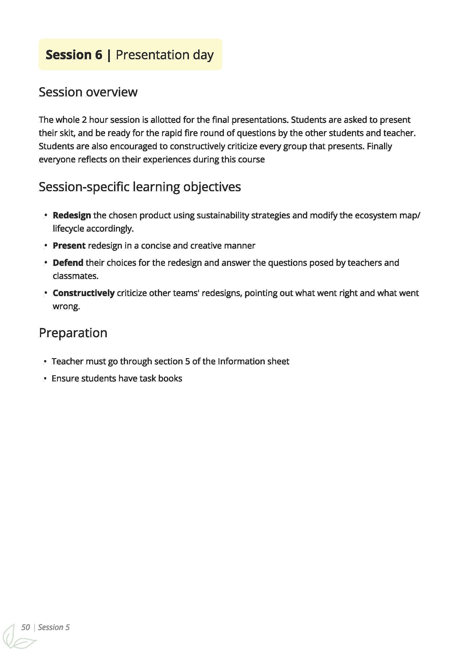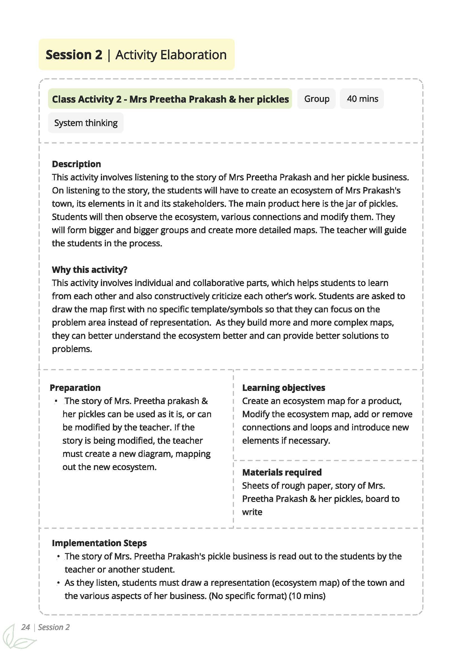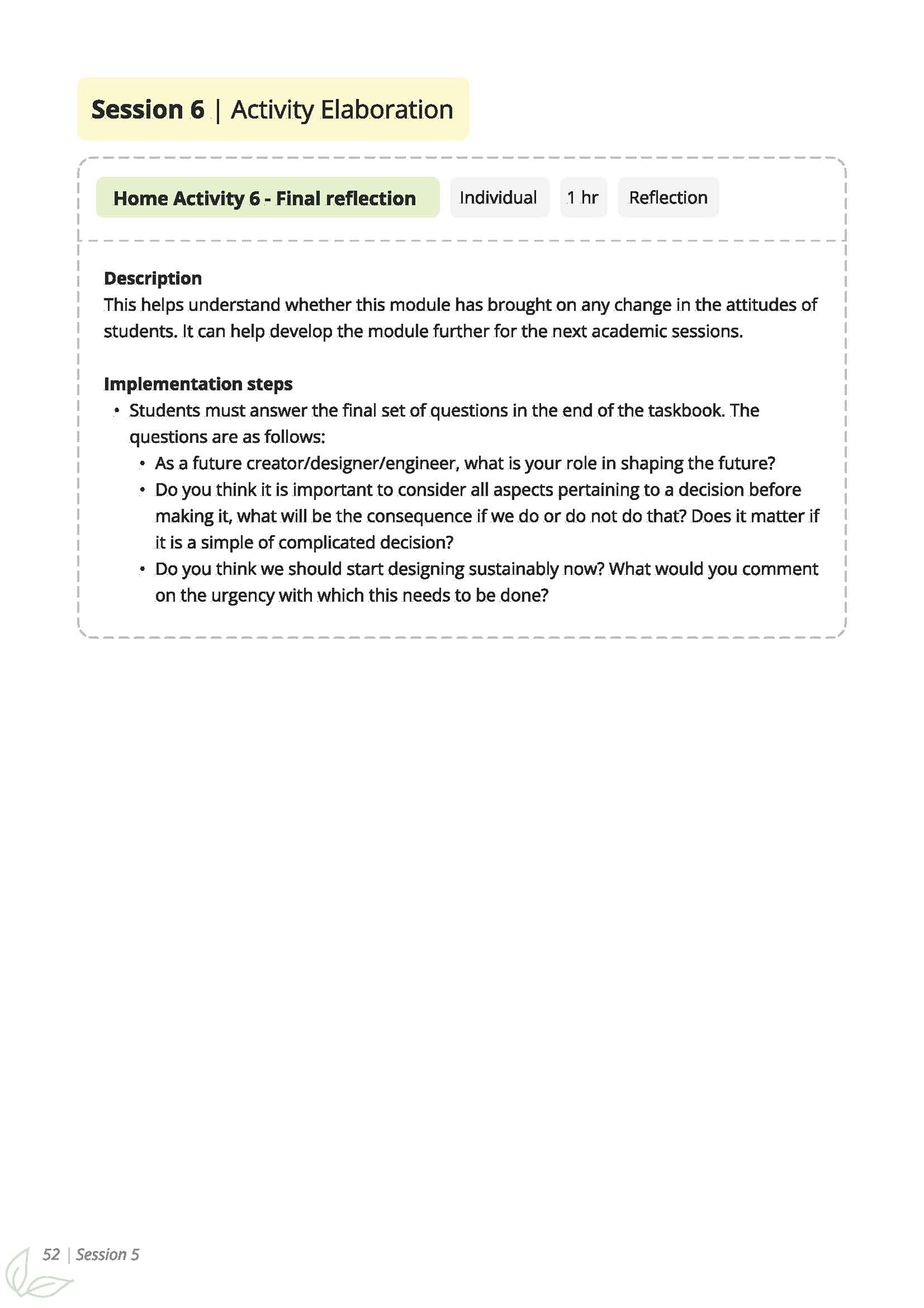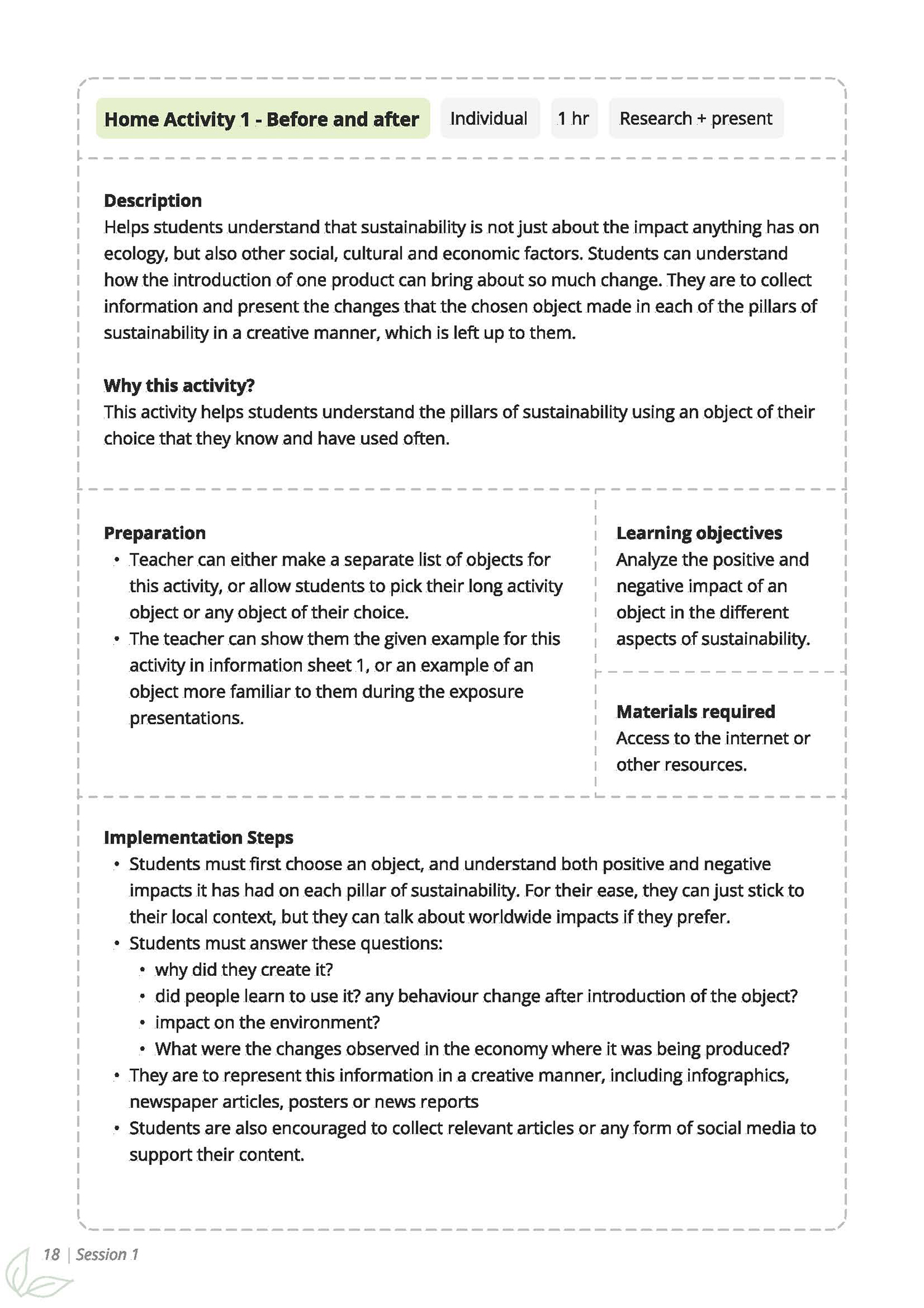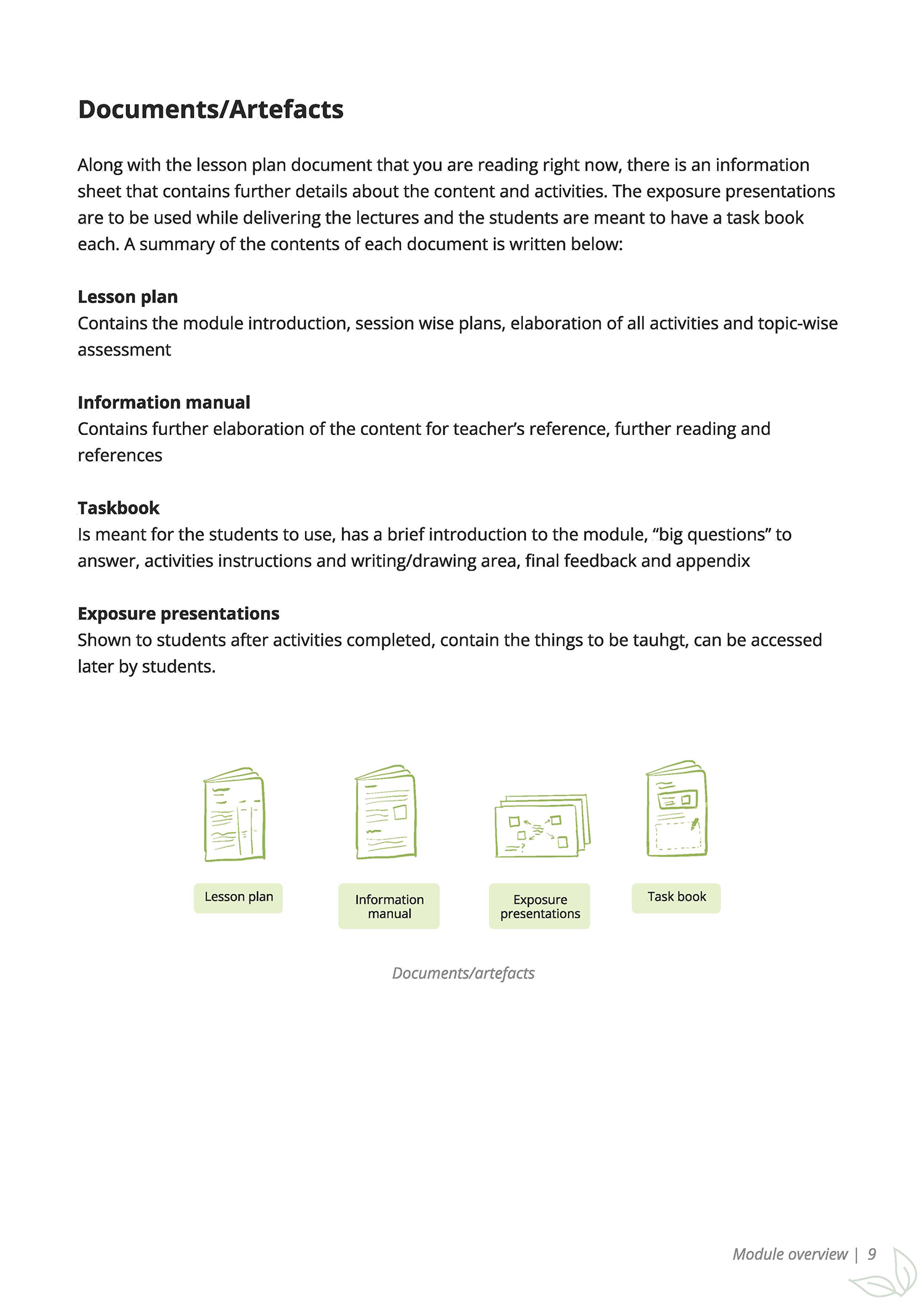 This module is a part of a much bigger design thinking elective for secondary school students of the CBSE board. This specific lesson plan is meant for class 10 students and aims to help students understand why we need to move towards more sustainable design practices and the approaches used to create more sustainable products. They learn to think holistically, in terms of systems, and analyse the lifecycle of a product. They finally learn about sustainability strategies and technologies and how to apply them. The module has been designed in accordance to Kolb's experiential learning cycle where new knowledge is built on top of existing knowledge that students already have.