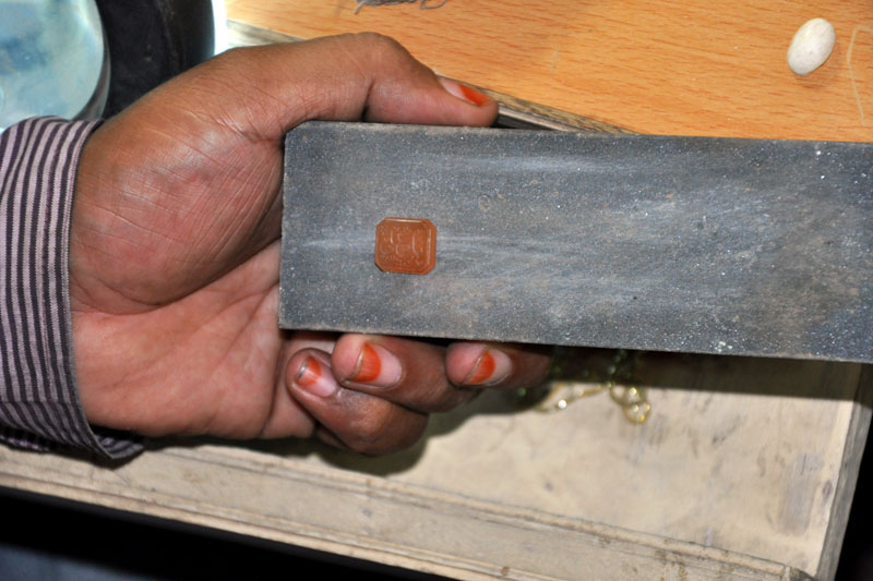 Raw Material: Quitabat is mainly done on paper or stone. Therefore artists use different handmade paper and precious and semi-precious stone to do the calligraphy. The main used stone is Jade, this stone is good for the heart, and therefore, verses written on it are highly respected. Artists use fine handmade paper which is either imported from different countries or made in India using different techniques and materials.