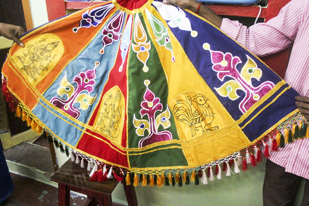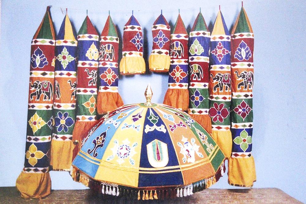 In the olden days, the craftsmen used to make canopies, banners, and umbrellas in applique for all major festivals held in Madurai's famous temple. As the craft's popularity spread far and wide through the mouth of pilgrims visiting the city, the craftsmen started making other decorative and utility items as well. Various products of applique work such as `Thombai', `Vasamalai' (arch work), Thoranam (ornamental artwork hung on door frames), etc., are used in the temple to enhance the aesthetic look. Thombai is available in various lengths and diameters. Mr. Sendrai Perumal, for more than a decade is into making temple applique artwork and decoration items in Madurai district, Tamil Nadu.