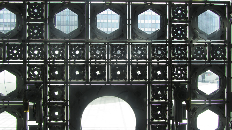 The Arab Institute in Paris has been set up to exhibit and showcase Arts, Music and Cultural aspects of the Arab world. The southern face of the building has been designed with an interesting repeated module based on the Arabic pattern. These patterns have openings (in fact 240 of them in each panel) which are sensitive to the light falling on them – in the sense they can respond by opening and closing like an aperture in turn controlling the light entering the building. The architecture is by Jean Nouvel along with Architecture-Studio.