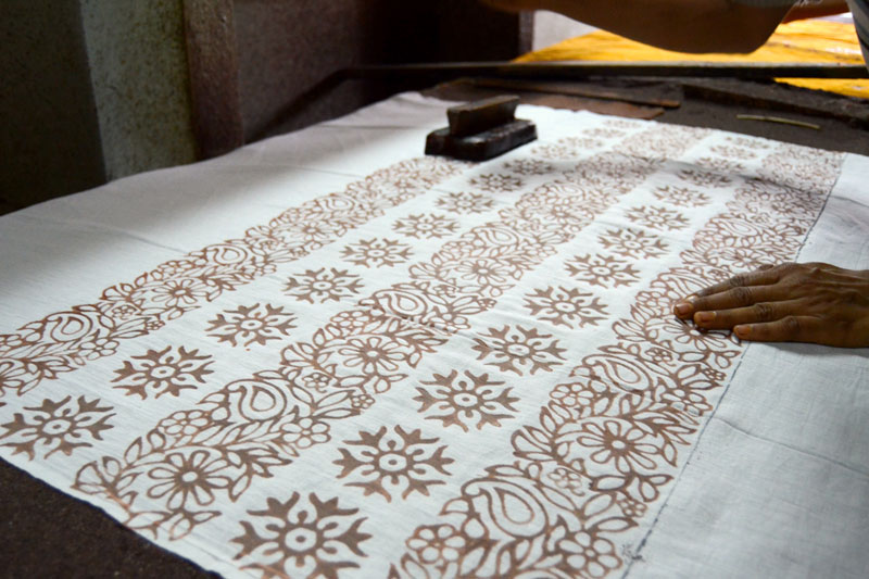 After the initial printing, the fabric is soaked in napthol. Then it is dipped in a cold dye of the lightest color, say yellow, for ten minutes. Once it is dry, it is waxed where yellow is needed and dyed in the second color, say red. This process is repeated as many times as the numbers of colors required. The characteristic effects of batik are the fine cracks that appear in the wax, which allow small amounts of the dye to seep in. These are actually formed by the cold dye bath. After the multi color dyeing is done, the fabric is dried and placed between two layers of absorbent papers. The wax needs to be ironed out of the material into the paper. Dipping the fabric in hot water can also get the wax to come off.