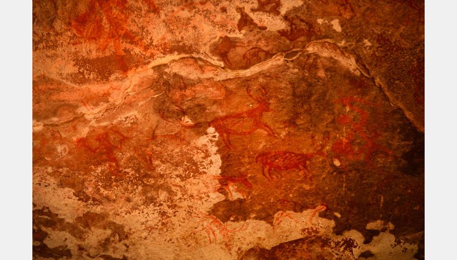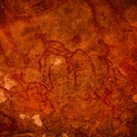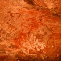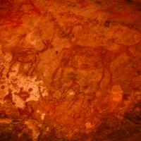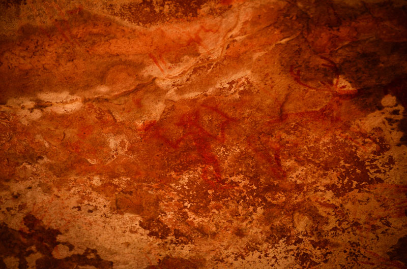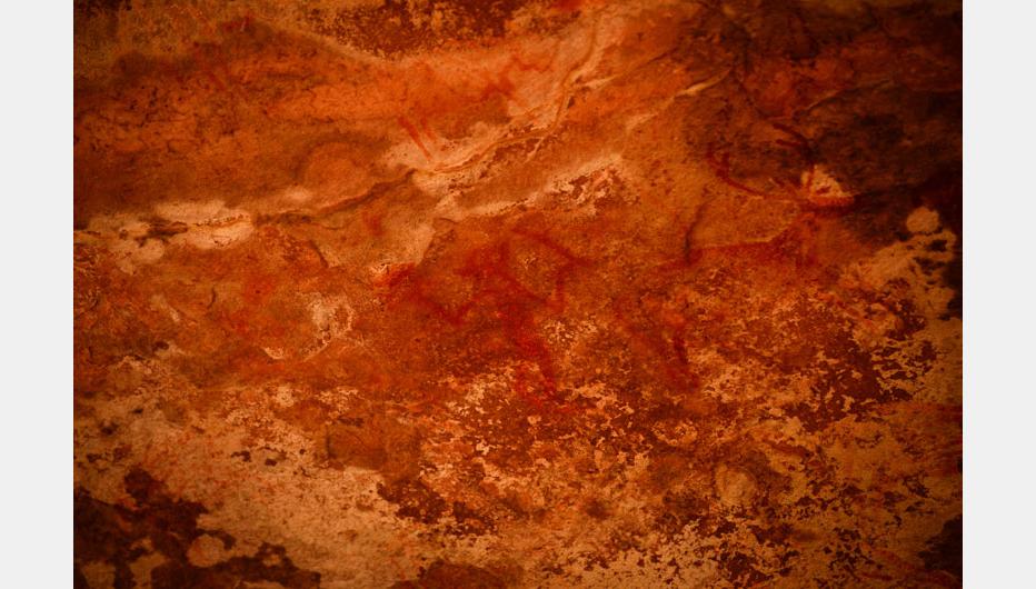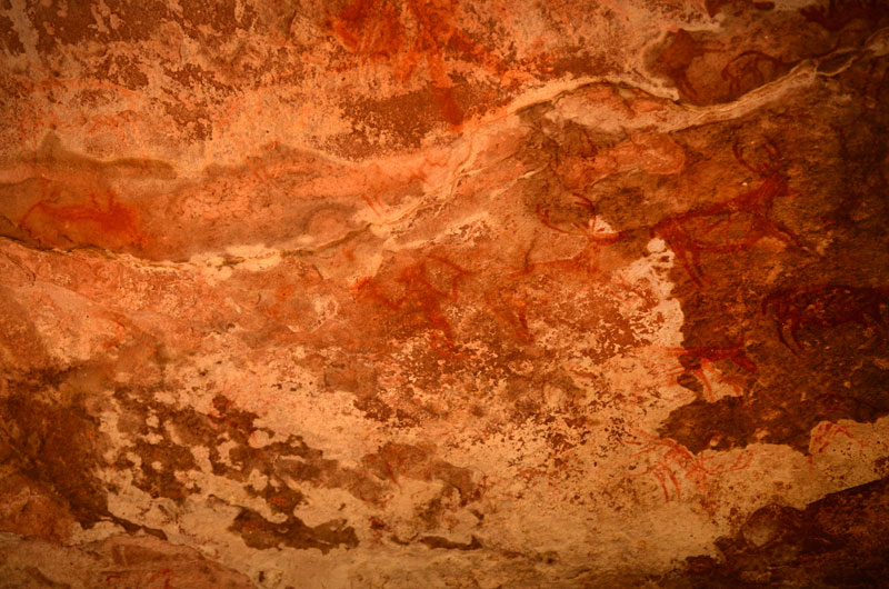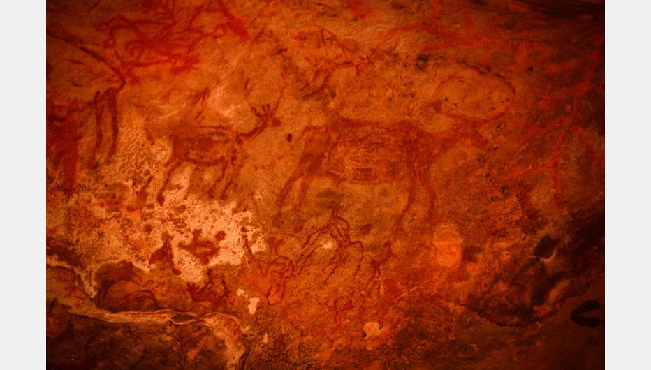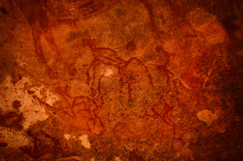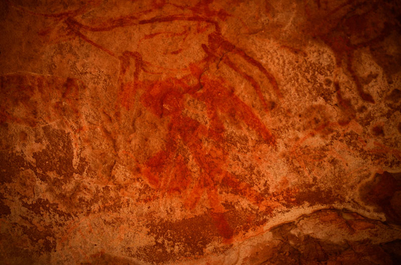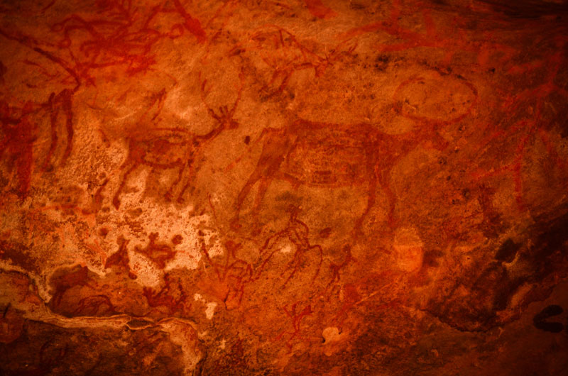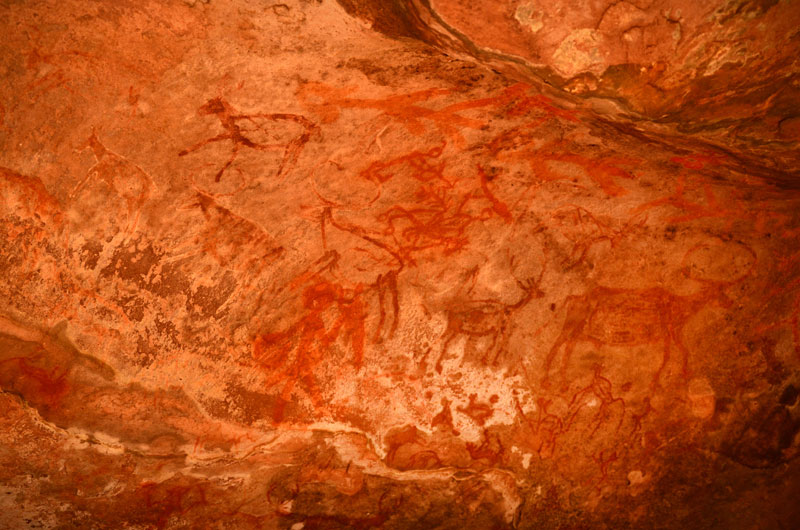 This enormous shelter with ceiling about 5.6 meters high displays numerous figures of humans and animals. The vertical wall forming a depression inside the shelter exhibits a painting of a buffalo with large horns. A galloping nilgai is depicted to its right. A man carrying a bow and sling shown in red color can be seen below. Various postures and color fillings on the bodies of animals can be noticed in this particular shelter.