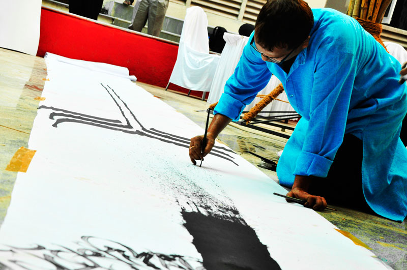 These photographs are of Achyut Palav, renowned calligrapher making the long scroll on the occasion of the conference 'In a Planet of Our Own' at IDC, IIT Bombay in September 2009.