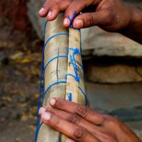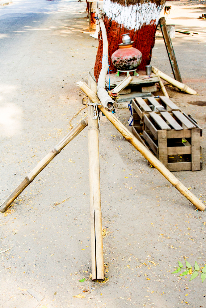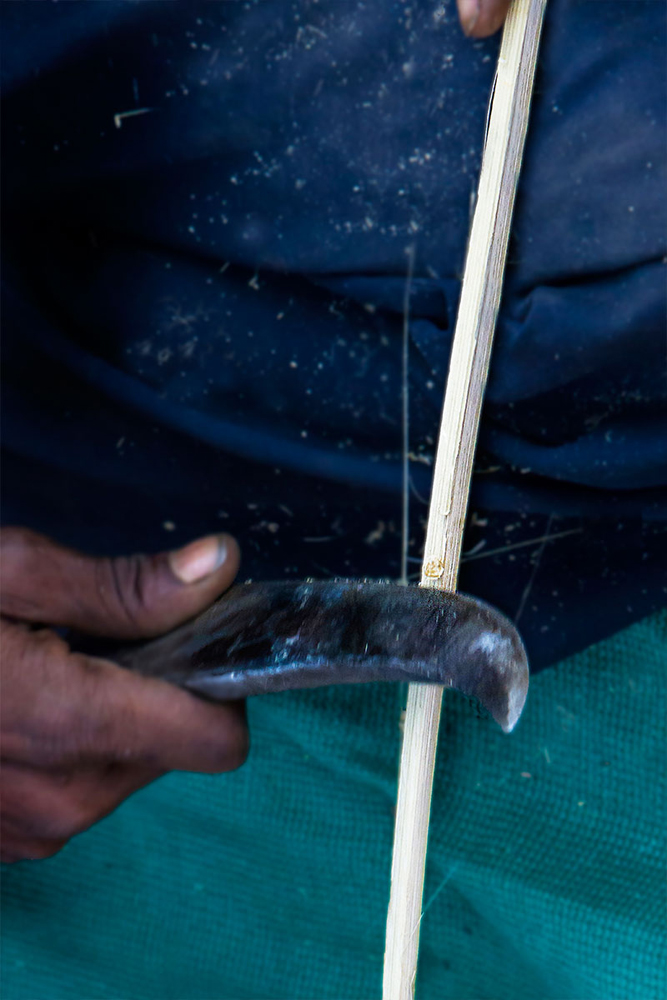Chick mat making looks simple, but it takes lot of practice and hard work to gain the expertise. The whole of the family members get involved themselves in the process of making chick mat. The craftsmen begin the process by taking the customer’s order. The measurements of the windows and doors are taken. Initially the first outer layer of bamboo is peeled with the help of a knife. Then they are cut by the saw tool according to the measurements. Bamboo is made into two equal pieces vertically, later it is sliced into sleek pieces through the help of the sickle. The wooden stick is tapped on the sickle with a force, to slice the bamboo.