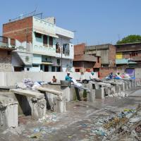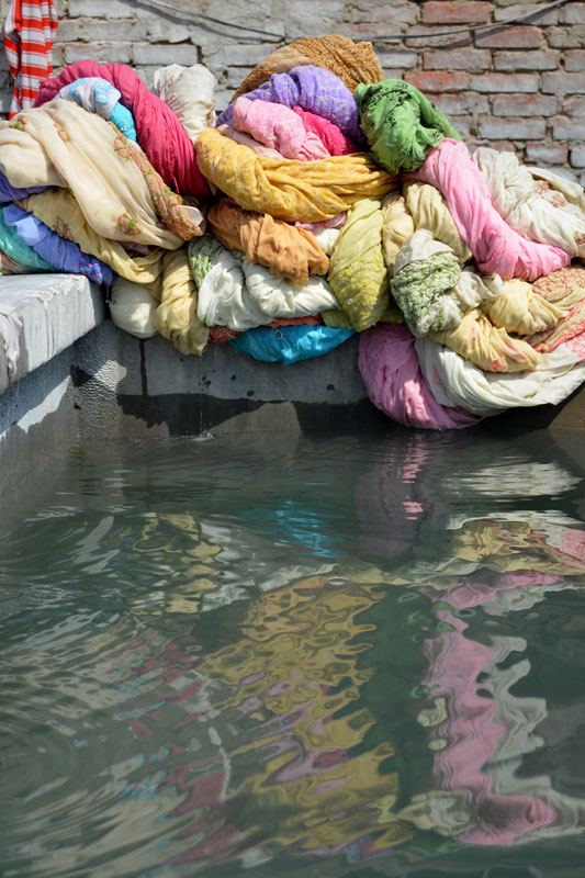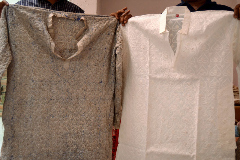 Chikankari is an ancient form of white floral embroidery, intricately worked with needle and raw thread on a variety of fabrics like cotton, muslin, silk, organza etc. After completion of process the article is checked carefully since most defects can be detected at first glance. However, the finer flaws surface only after washing. A little bit of ‘tezaab’ is added to water and the embroidered garment is soaked in water for five minutes. This removes the ‘neel’ or the blue color of the print. The next step is to bleach the fabric. Rubber gloves are worn during this process. Garments are soaked overnight in a mix of castic soda, bleach, ‘ghadi’ powder and ‘ghadi’ soap overnight and washed with water the following day. About sixty thousand garments are washed daily at this dhobi ghat. After this, the garment is starched and let to dry in the sun. Once dry, these are ironed and packed!