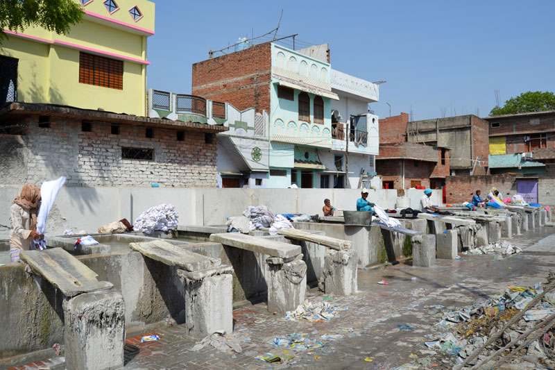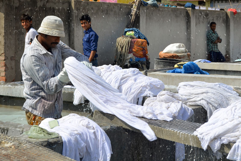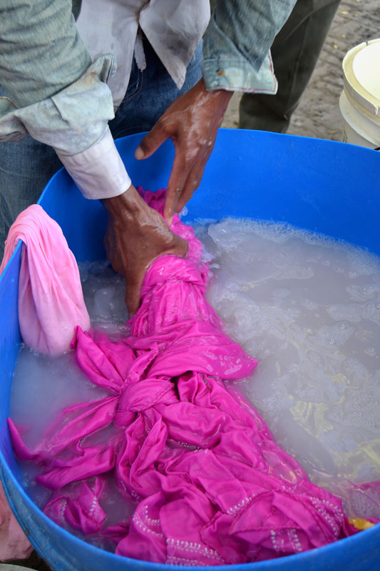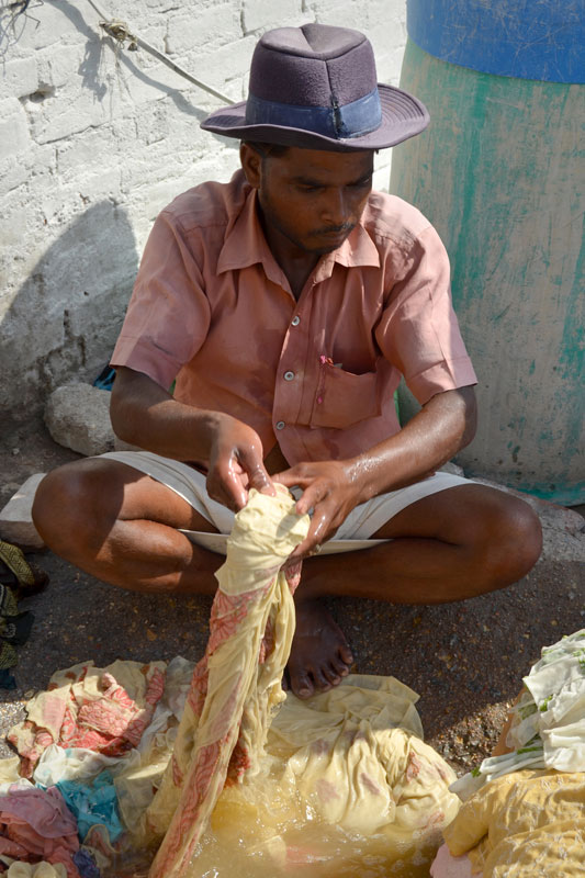 A dhobi (washer-man) rubbing the clothes in ‘tezaab’ and water.