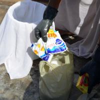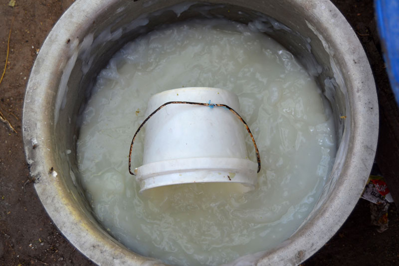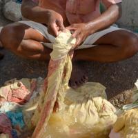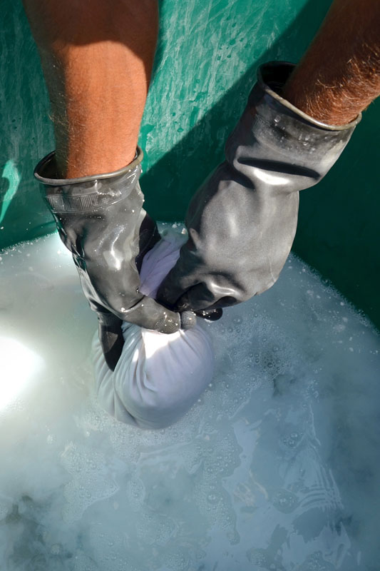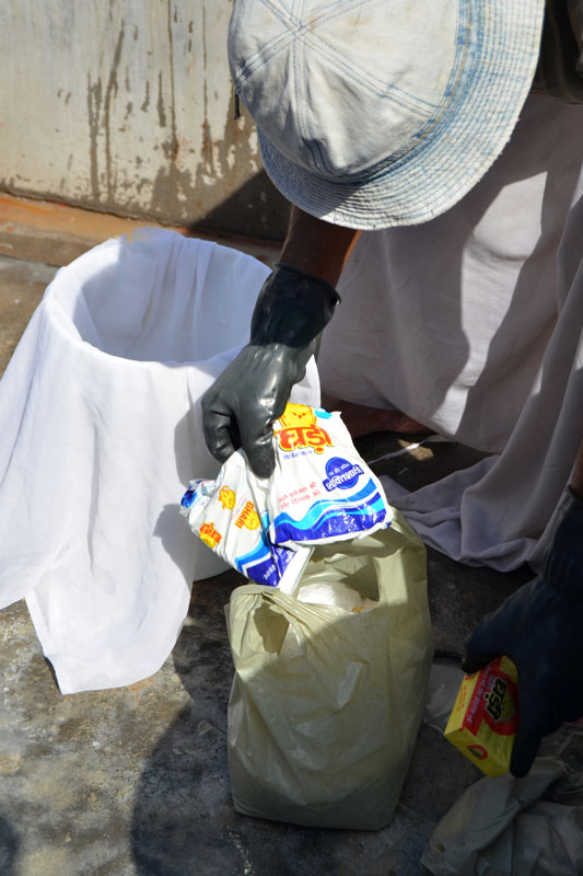 A dhobi preparing a mix of bleach, castic soda, ‘ghadi’ powder and soap to soak the garments.