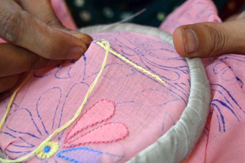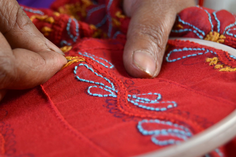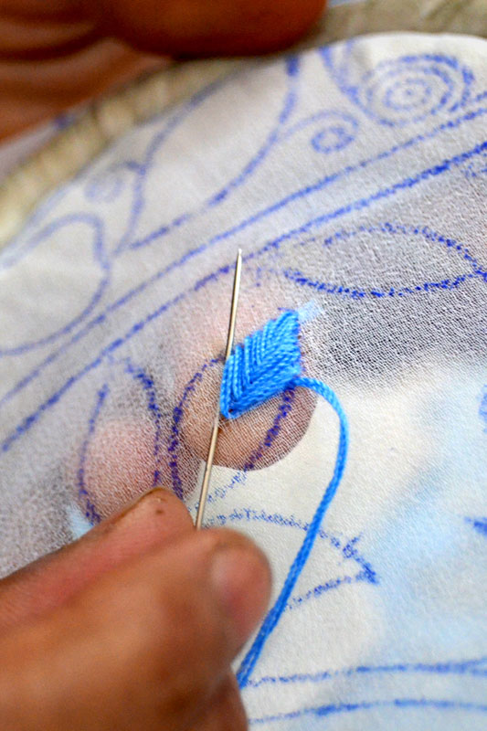 The patterns and effects created depend on the types of stitches and the thicknesses of the threads used in the embroidery. Different specialists work with different types of stitches. Each worker completes his/her bit and the fabric is then sent to the next embroiderer. Thus, each hand-crafted piece talks volumes about the number of people involved in making it and the long hours put in.