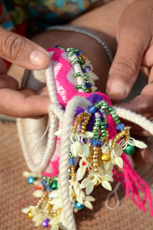 Jobat lies in the Alirajpur district of western Madhya Pradesh and is a predominantly tribal area. Though the men here usually dress simple and subtle, the women love to wear bright colors and jewelry. Amongst these, accessories made of beads, cowries and feathers are an all time favorite. Chomal is a type of headgear that was traditionally used as a cushion to carry earthen pots on the head. The more decorated ones are given to the bride in her marriage to wear and on top of it is kept a large pot in which ‘dahej’ or dowry items are put in. The circular base is made by weaving a geometric pattern with wool on a broad band of cane. It has beads or metallic droplets intermittently that tinkle while walking. Rani Bai is the only woman in the village who does chomals of this kind. She uses glass beads, not plastic, and puts in great effort in choosing her colors.