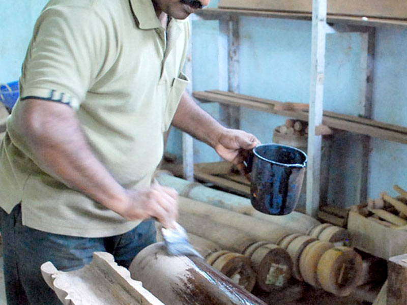 Alleppy located in Kerala is well known as the land of coconuts. The art of making useful products from coconut shell is practiced in Alleppy. Coconut wood logs and pieces are kept in water tanks or ponds for soaking. Proper water and Chemical treatment strengthen the wood and increase its durability. Based on the nature of the product and its requirement the duration of water treatment is decided. Small tadpole-size fishes are kept in the water tank to provide protection from mosquitoes.