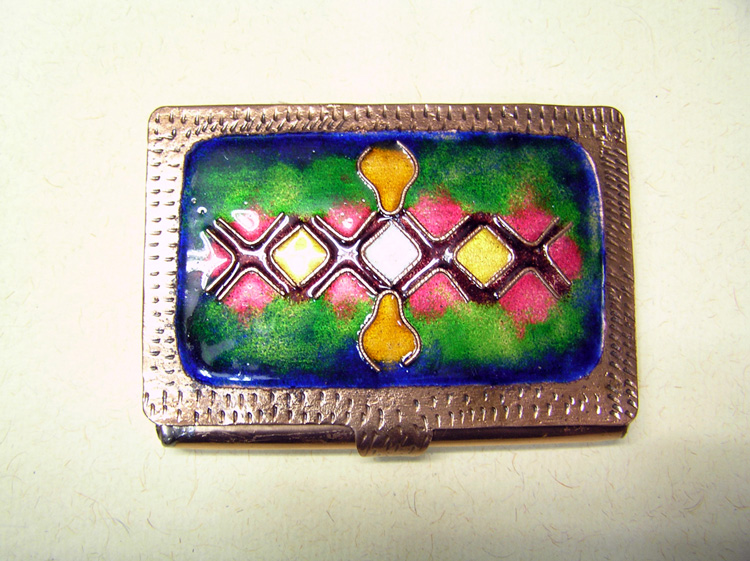 Enameling is done by pouring hot molten glass coloured with various oxides (to give it different colours) on to the copper surface.