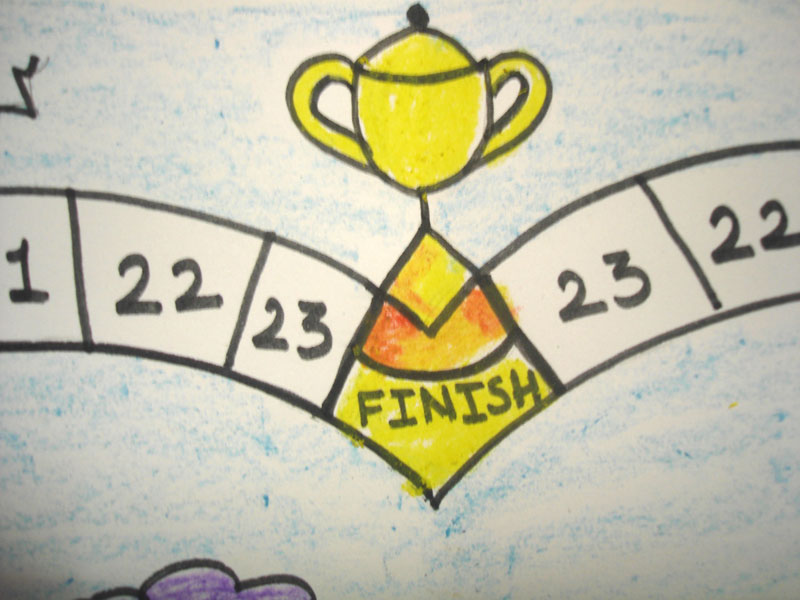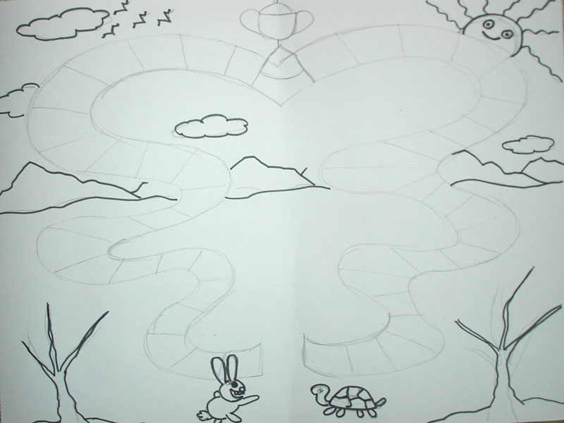 Rules of game - Move one step ahead on the side of rabbit if you throw 1 on the dice first. The second player is on tortoise’s side. He/she should move two steps ahead if he/she lands on the green square. Move two steps backward if you get to red square. The winner is the one who reaches the finish first.