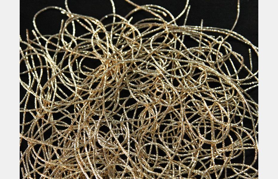 Types of Embroidery Threads used are: Milliary Wire - A two part thread, consisting of a central core wire, with a coiled wire around it. Pearl Purl is a wire that is wound into a tight coil that looks like a strand of gold pearls. Bullion Threads are very fine wire threads wound into a tubular shape, similar to purl threads but tend to stretch. Twists or Torsade thread is made of multiple strands of metal twisted together. Matte Embroidery Cotton - The thickness of matte embroidery cotton comes from a tight twisting of 5-ply thread, which makes this floss eminently suitable for embroidering on heavy fabrics.