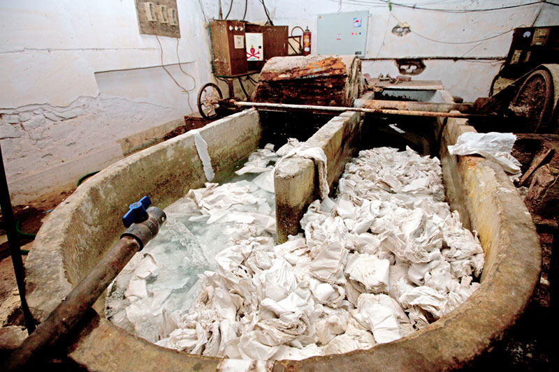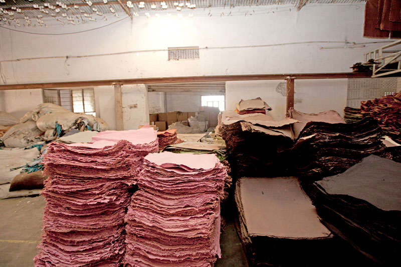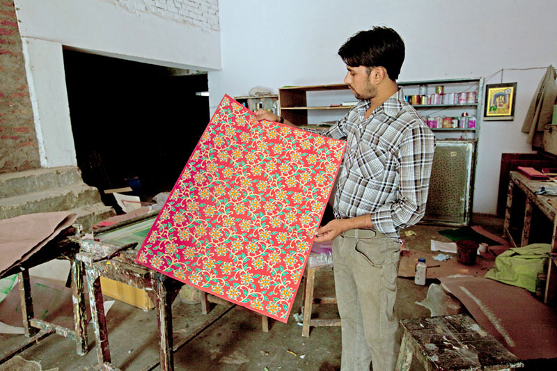 Sanganer in Jaipur became the main center for making handmade papers. Handmade paper craft was traditionally practiced in Sanganer. It was brought in India by Mughal from Turkey. The craft flourished due to its constant demand and new interventions made by the artisans. The craftsmen belong to Kagzi community who traditionally specialized in handmade paper production. The term Kagzi is derived from Kagaz(paper). The making process involves several stages including rag chopping, beating, pressing, drying and cutting. The collected raw material is first bleached as to remove color and whiten the hosiery cloth. The bleached cloth is finely chopped into small pieces. Then the waste paper and the cloth pieces are mixed together with water in a beater. The beater machine finely beats the raw material to make the pulp. The pulp is evenly poured in a mold which contains two frames. The screen holds the pulp and the water drains out. The wet pulp is transferred onto a cloth and pressed to make the thick sheet. This process is repeated until the required uniformity is achieved. The sheets are dried after squeezing the water. For the colored sheets the dye stuff is added in the pulp during the beating process. Some papers are colored externally after the paper is dried. The dried papers are inspected for the quality and then smoothened. Very natural materials like whole flowers, marigold petals and grass used to create motifs. Motifs are also created by stitching, embossing and painting.
