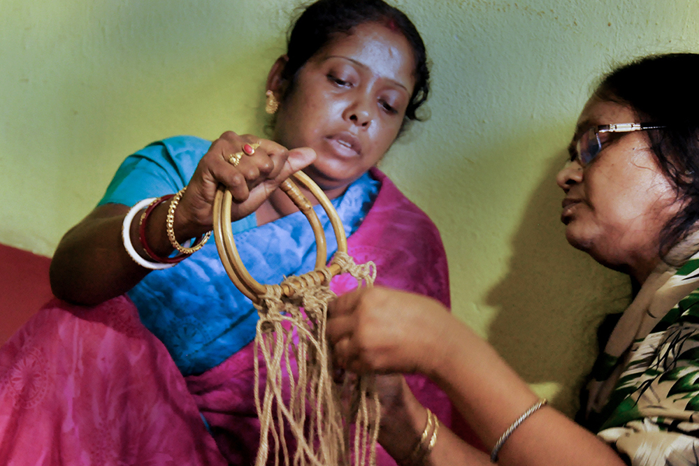 The making of Macramé involves certain hand movements that prove to be a great exercise method for fingers and the wrist. The hand joint seems loose and strong with regular practice of tying macramé knots. Jute craft making is a hobby for many women artists. Mrs. Nupur Bhawal from West Bengal is spending her leisure time making handicrafts. She has been practicing these crafts for many years. Her hobby is turned into a profession.