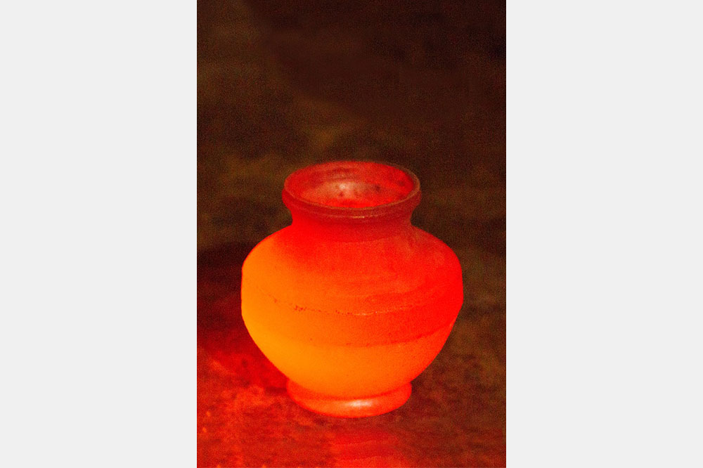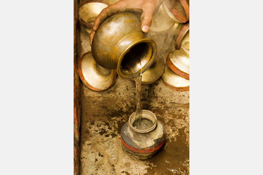 Nowadays Kamandalu is made of brass, copper, silver and also with clay sometimes. Aesthetically speaking it is a beautiful combination of brass and copper. As the copper represents river Jamuna and brass represents river Ganga, this type of Kamandalu is called as Ganga Jamuna Kamandalu. It is a round shaped pitcher with a wide-open neck that has a semicircular handle attached to the mouth of the Kamandalu to facilitate the grip when carried and a snout - through which the water can be poured in a controlled way.