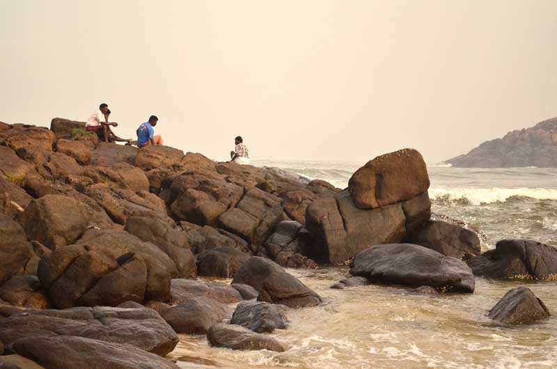 Fisherman sitting on the rocky outcroppings that separate the Hawah Beach and the Lighthouse Beach.