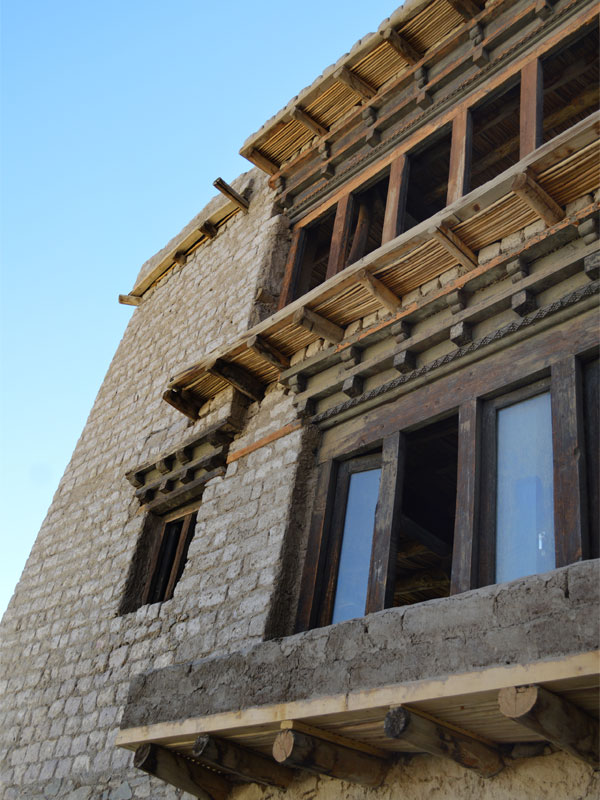 Panjari's are screens, and a Rabsal is a protruding wooden balcony, both are conspicuous parts of a Ladakhi house that a family owns, depending on their position and status. Rabsal's are always attached to the sitting room or the 'don-khang' of the house, its where the guests could be entertained and dinners hosted. Adding some flamboyance to the simple stone and mud buildings the rabsal serves a practical purpose, allowing maximum sunlight into the house, keeping away the cold draughts and dust from the spacious terrains. They also become a large window for the family to enjoy the view outdoors. The absence of glass in earlier times, gave way to mesh-like designs called 'pinjkari' or 'panjari' incorporated into the rabsal, they work like shutters that can be opened during the day and closed at night. It is difficult to say where exactly the idea of the rabsal was initiated or when, but some sources state that it could have originated from Kashmir and others, from Tibet.