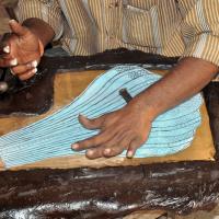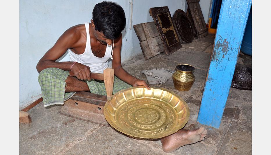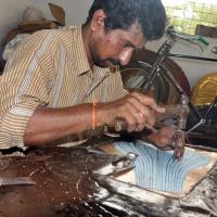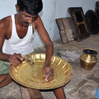 This craft is practiced in Nalgonda district and the craftsmen follow the method of embossing on brass and copper sheets. In this technique, brass or copper sheet is cut into the required size and shape and fixed on a wooden table with four sides of the sheet covered with lac (lucca). Lac effectively fixes the sheet on wooden plank or table. Design is drawn on a paper sheet and the sheet is pasted on the brass sheet. The designs are carved on the sheets using fine instruments (chisel).