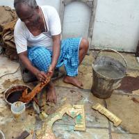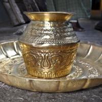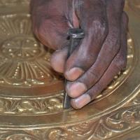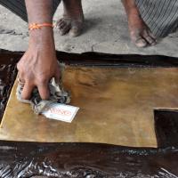 After the basic carving the paper sheet is removed. Later the lac is heated and the carved brass sheet is removed from the wooden plank. Further fine carvings are done by hammering the sheet with different shape and sizes of chisels. Later the sheet is cleaned with ash powder and the depth of the embossing is done. Parts of the product are designed and embossed separately and later welded together using gas torch burner. The embossed sheet is then washed with acid and brushed with tamarind water giving the article shine. After washing it is filed to smoothen the edges and buffed to give shine and luster to the surface.