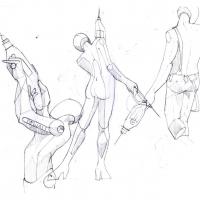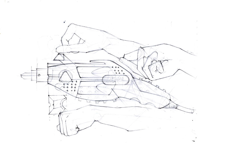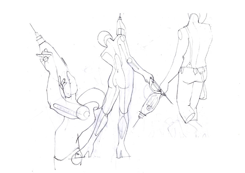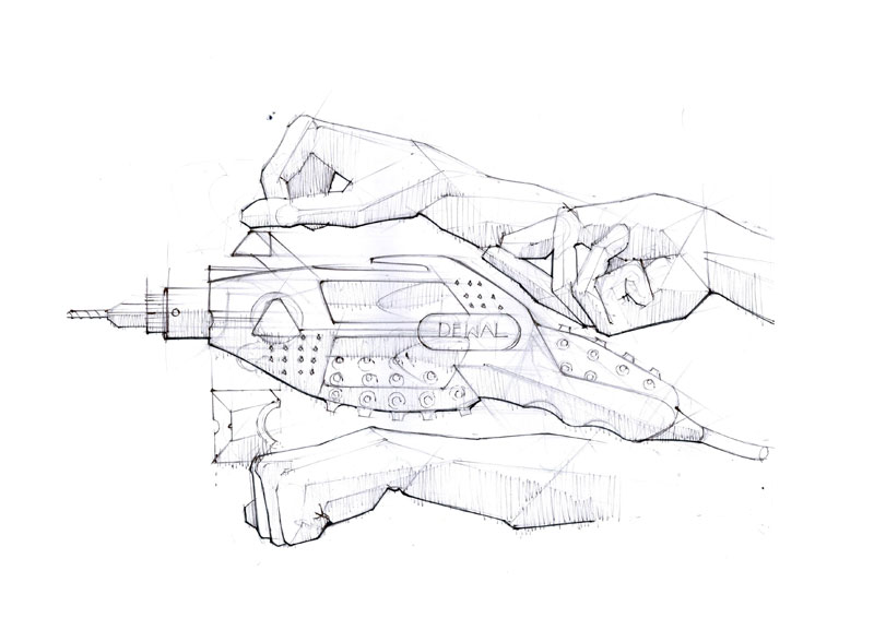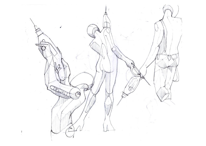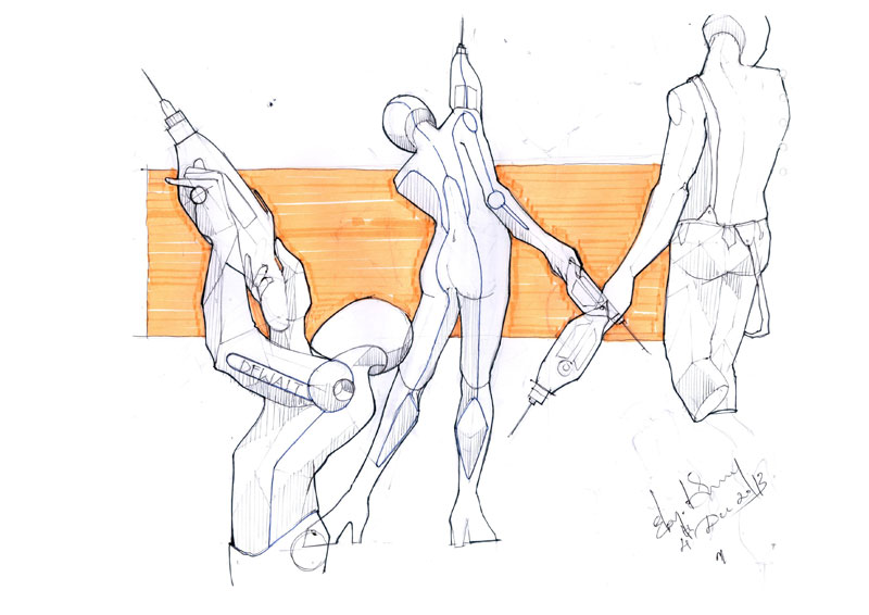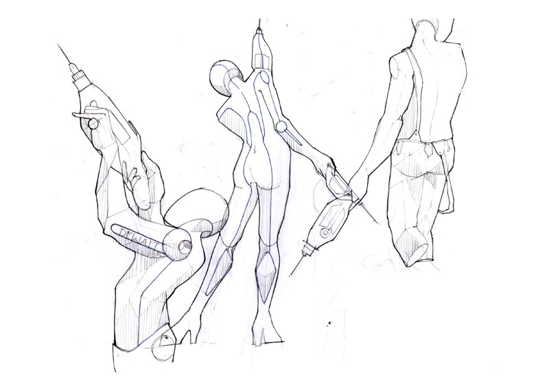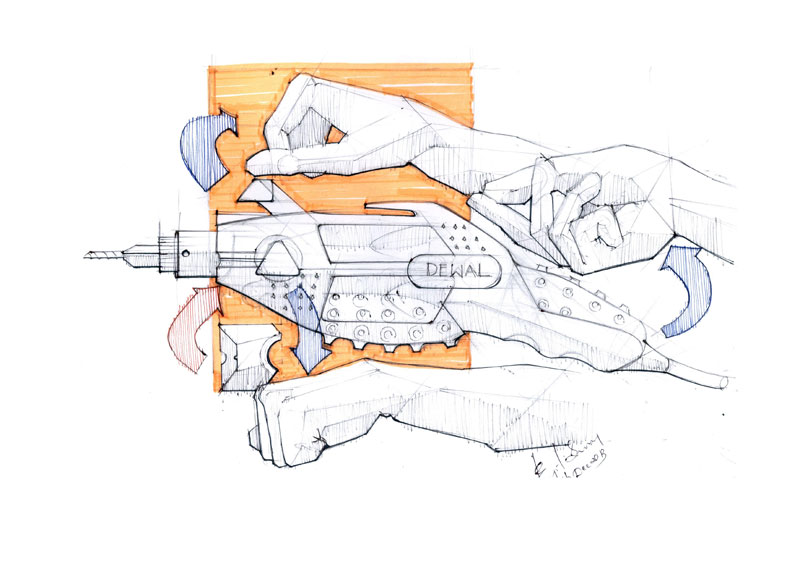 This is effort to showcase the various stages involved in coming out with a new design and defining a style statement for the product. The example shown here is a hand driller. This design is a new design, and though various hand holding position the way to use the product is explained. Use of human figures here is to give an idea of the scale and also a statement is derived in the same way. The idea here is to explain the sketching style and explanation method which is vital for a product design presentation.