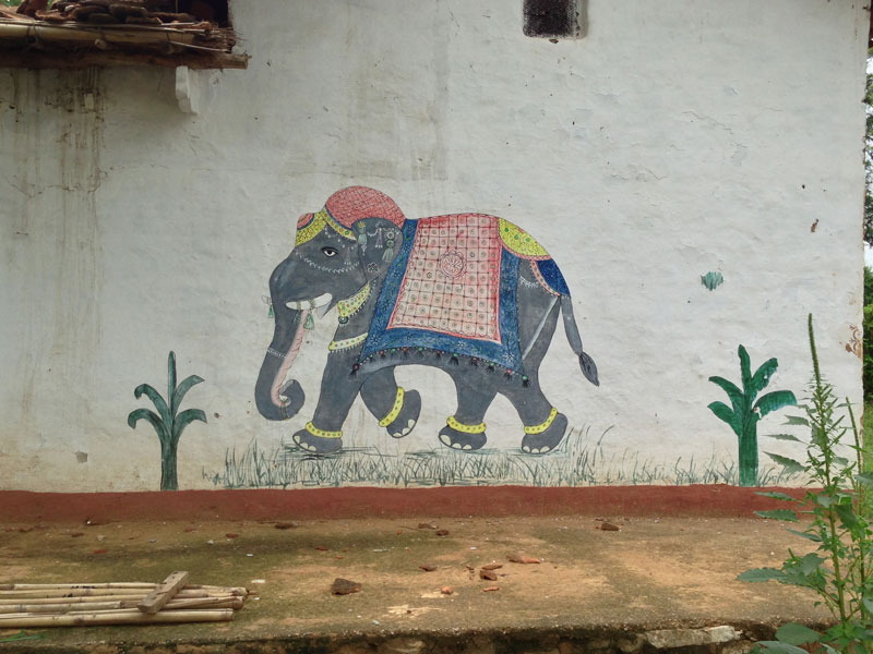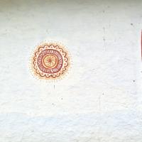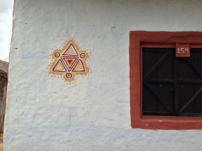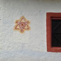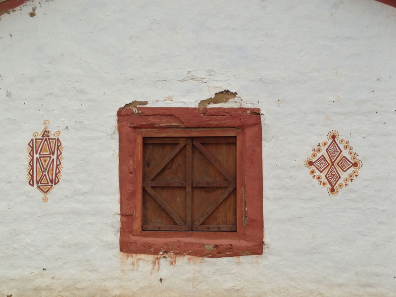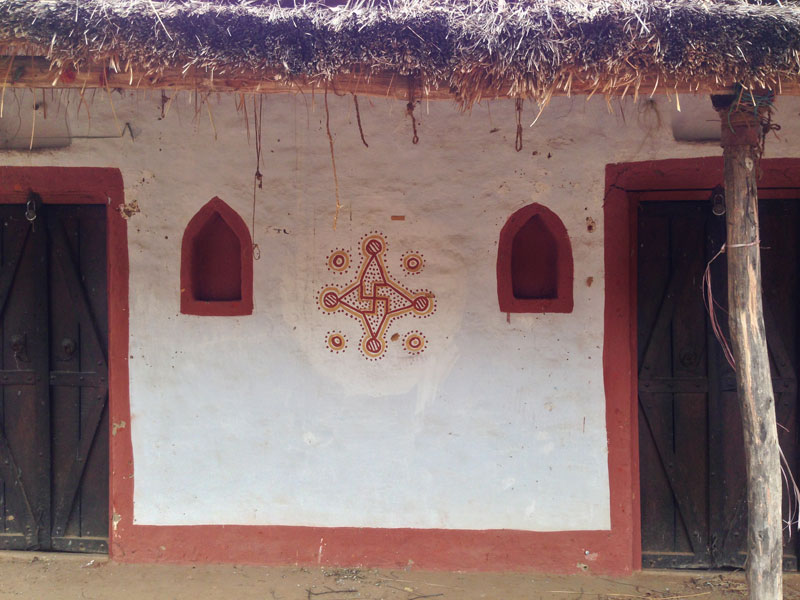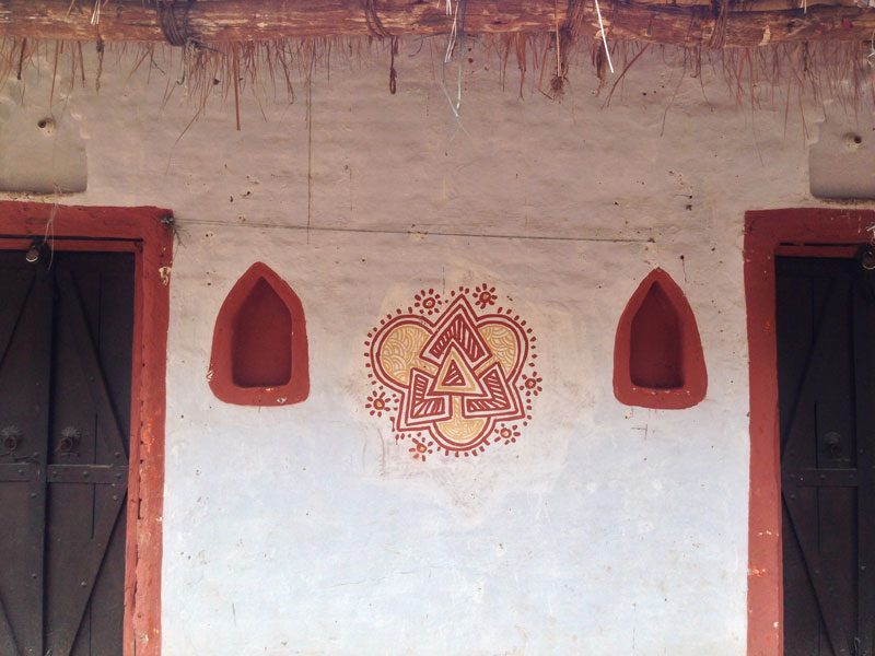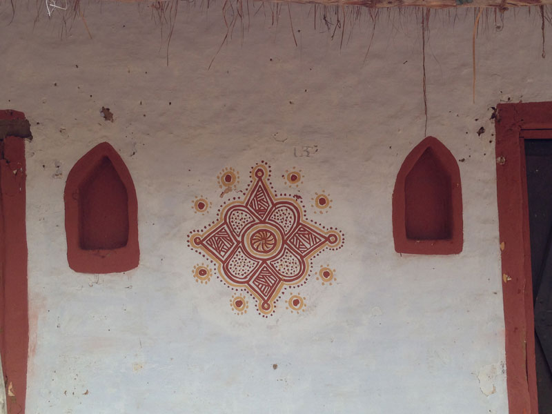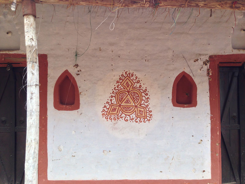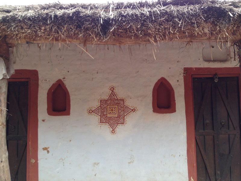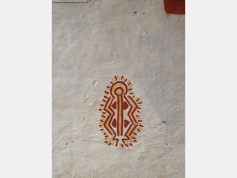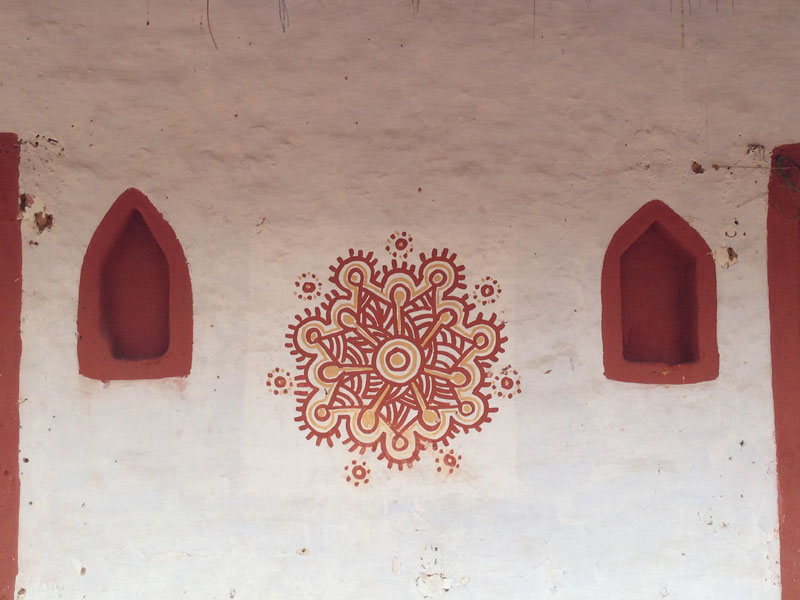 White wall houses depicts social status of the family as very few houses have kali(white wash). A certain style of mandana was observed in Bikaner on such houses where only geru(dark red sand paste) is used to make the design. These designs and patterns used have dots, lines, triangles, circles, animals, birds, holy symbols, flowers etc. Traditionally it's painted with a piece of cloth.