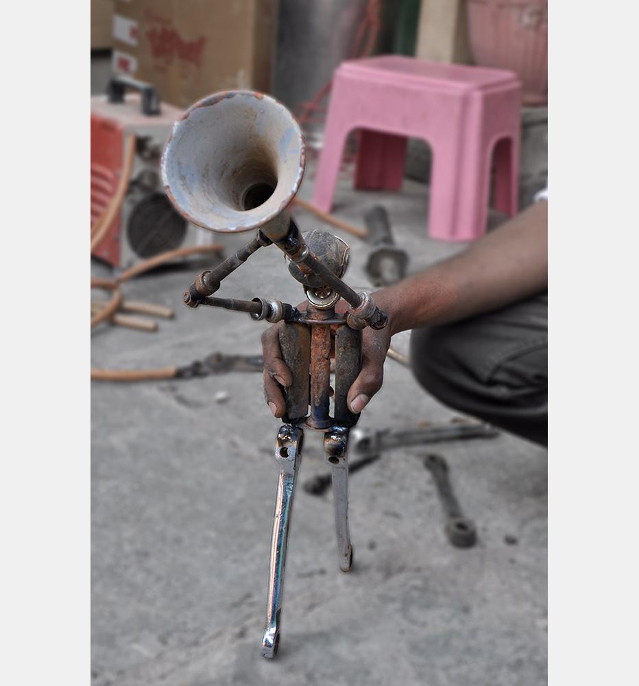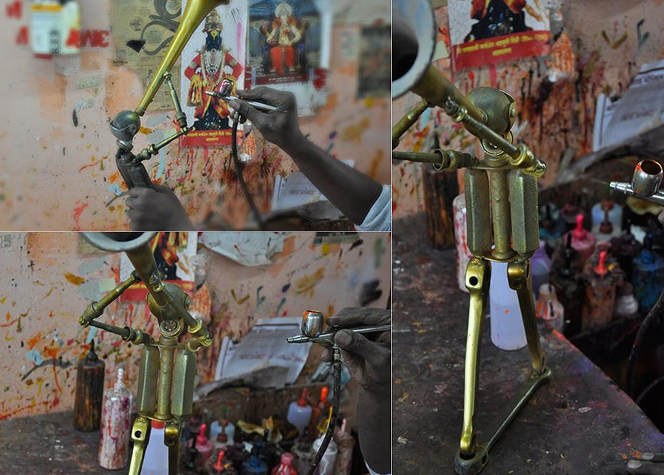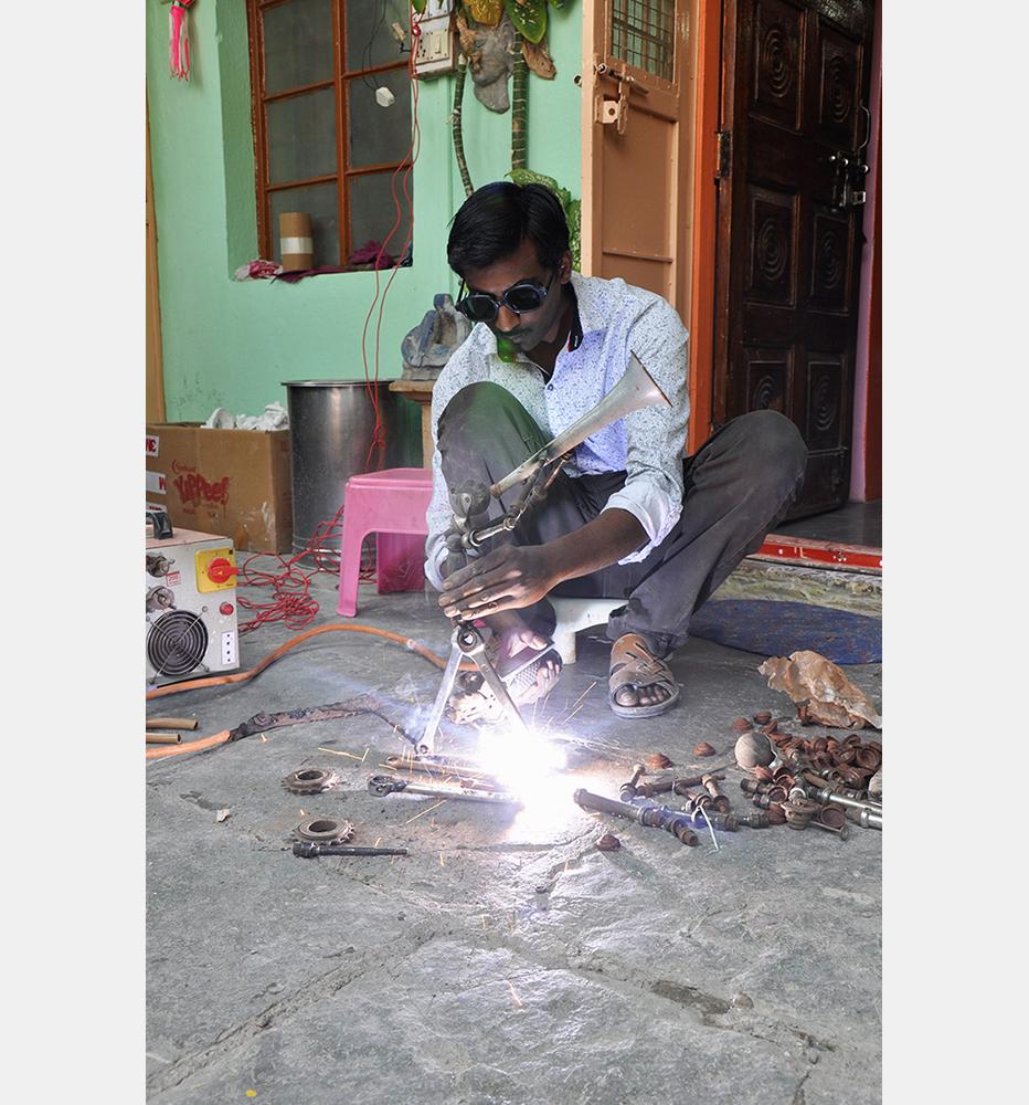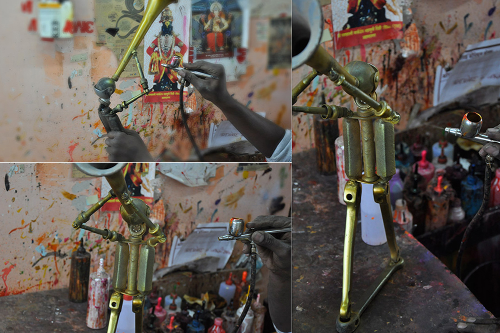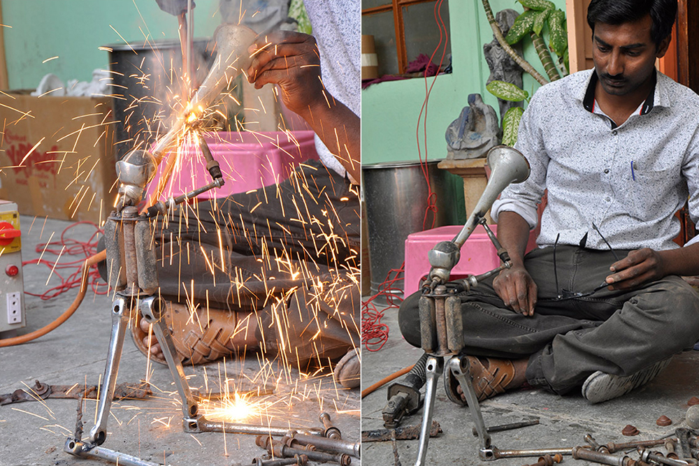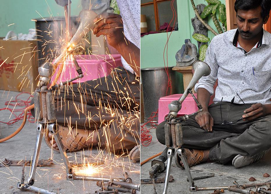Mr. Balaji Vallal is a well-trained sculpting artisan who runs his art workshop in Ahmednagar, Maharashtra. At the center, sculptures of clay, fiber casting, metal spoon birds, and scrap metal statues are developed, which are widely exhibited as well as sold to customers spread widely. He has been felicitated with awards and mementos for his contribution to his area of expertise. Scrap is a leftover obtained after a greater portion of something has been used, thus qualifying itself to be recyclable material. Firstly, the artisan gathers scrap metal pieces that suit his/her idea of sculpting. Once selected, these parts are arc welded step by step, at the end of which all the parts are fixed together. Then this semi-finished structure is painted with latex paint using a spray painting gun for a flawless finish.