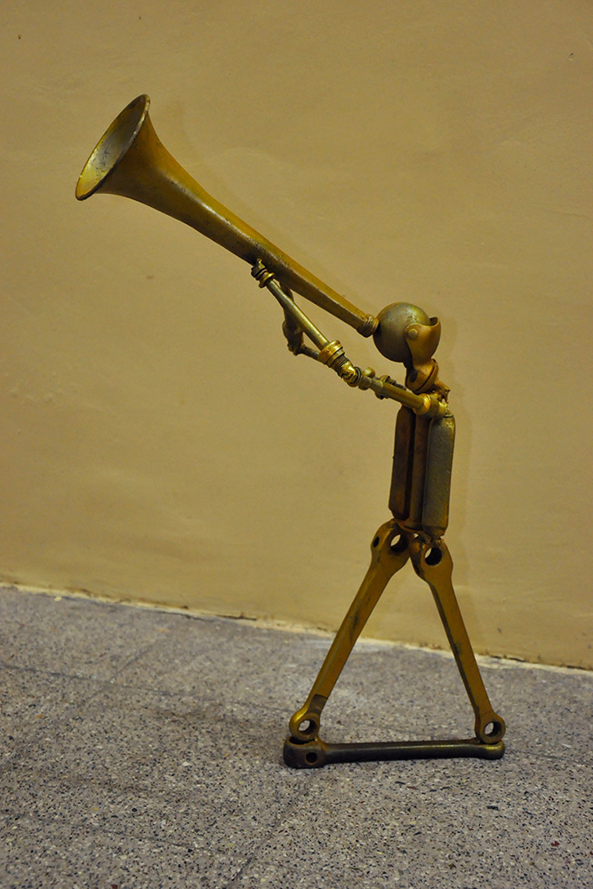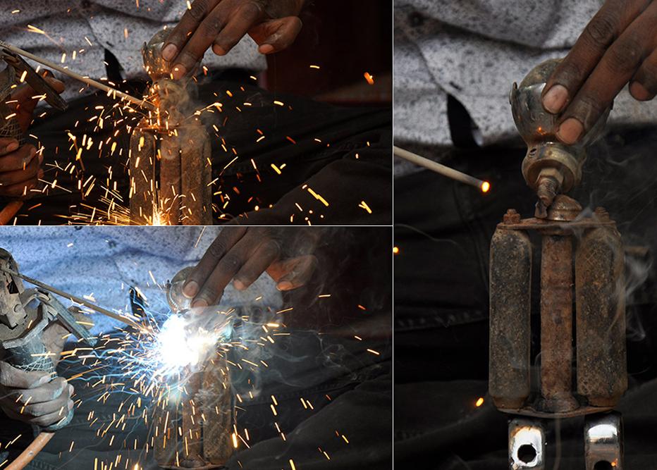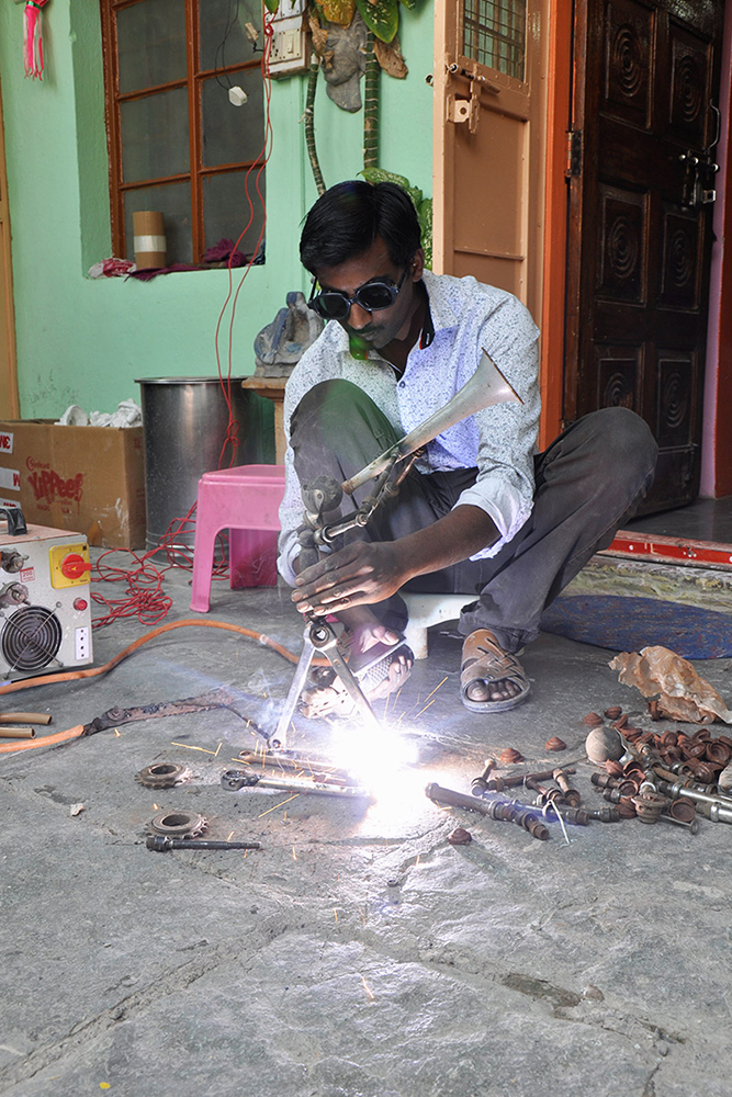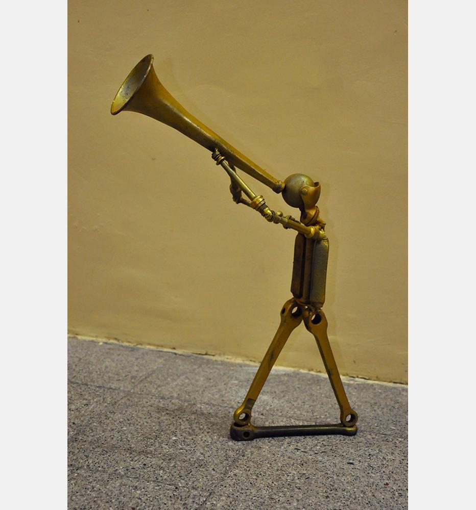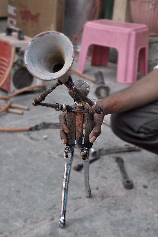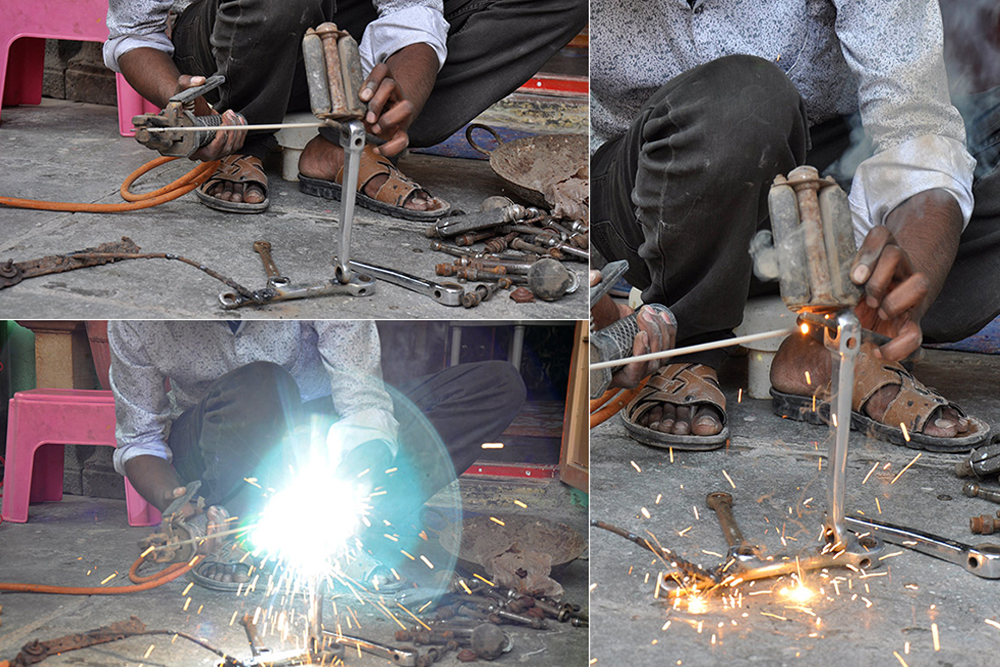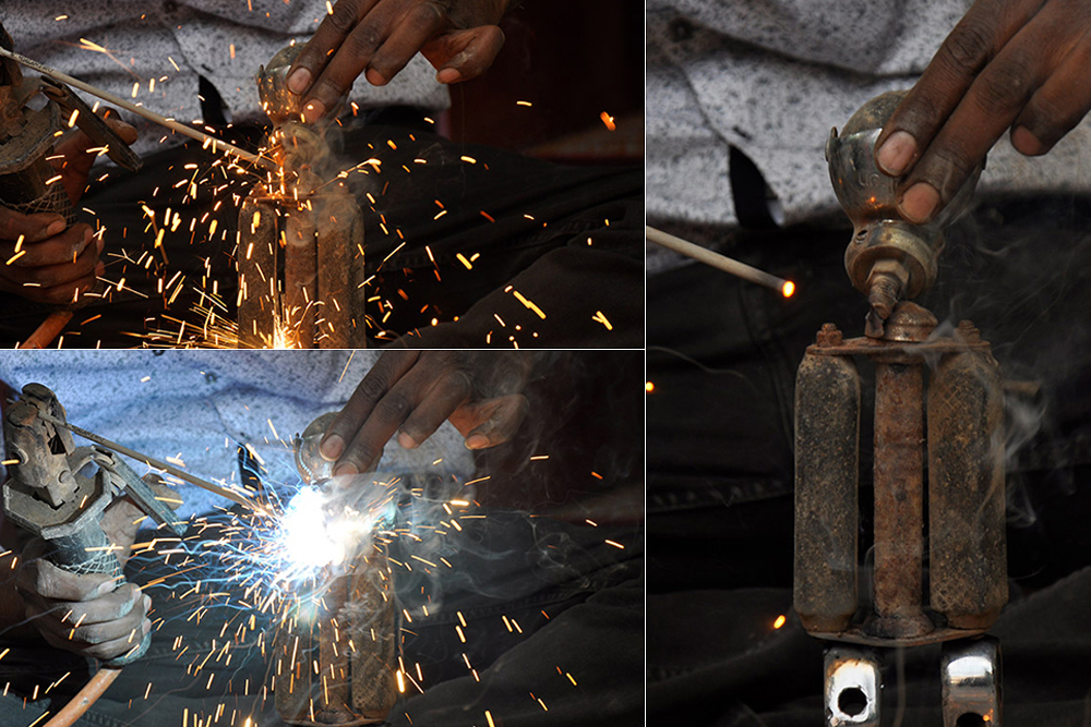 Mr. Balaji Vallal is a well-trained sculpting artisan who runs his art workshop in Ahmednagar, Maharashtra. At the center, sculptures of clay, fiber casting, metal spoon birds, and scrap metal statues are developed, which are widely exhibited as well as sold to customers spread widely. He has been felicitated with awards and mementos for his contribution to his area of expertise. Scrap is a leftover obtained after a greater portion of something has been used, thus qualifying itself to be recyclable material. Firstly, the artisan gathers scrap metal pieces that suit his/her idea of sculpting. Once selected, these parts are arc welded step by step, at the end of which all the parts are fixed together. Then this semi-finished structure is painted with latex paint using a spray painting gun for a flawless finish.