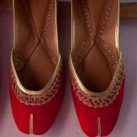 Red and golden combination shoes usually worn in festivals and marriages.