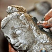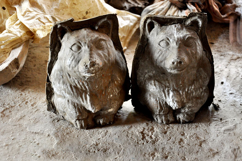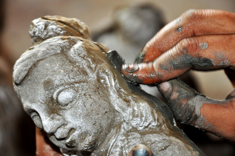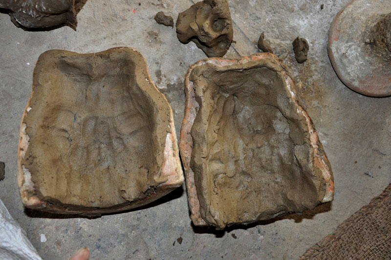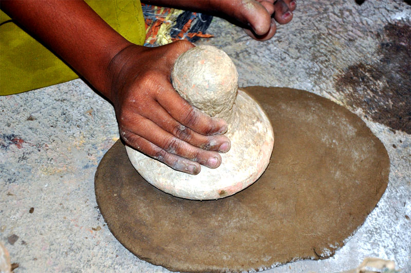 Allahabad clay products are unique and matchless. Each product is unique. In the basic process of clay moulding; the clay is processed, preserved for few days and then used for making the pottery. Initially, the clay is preserved up to 15 days as the preserved clay is very much suitable to make fine products. It is allowed to dry under the sun for 2 days. Then it is filtered to remove the stones and impurities using iron sieve. The processed mitti is mixed with water to prepare dough. The dough is finely mashed with hands to make it soft. Smaller amount of prepared clay dough is taken and flattened in a circular shape like chapatti. Two moulds which are made of POP (Plaster of Paris) are taken in modelling process. Boric powder is sprinkled on the mould as it helps to avoid contacting with the clay while removing the clay model. Now the prepared wet slab of clay is placed on the mould and pressed into it until it takes the proper shape of the mould. The mould consists of two parts to form one idol. The two mud filled moulds are joined and pressed to fix the corners of idol. Now the mould is carefully removed to reveal the idol. The idols are allowed to dry under the sun for two days. Proper care is taken to avoid the cracks due to excess heat. Finally the products are burned/ heated in a closed kiln. Embellishments are added through painting to enhance the external beauty.