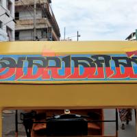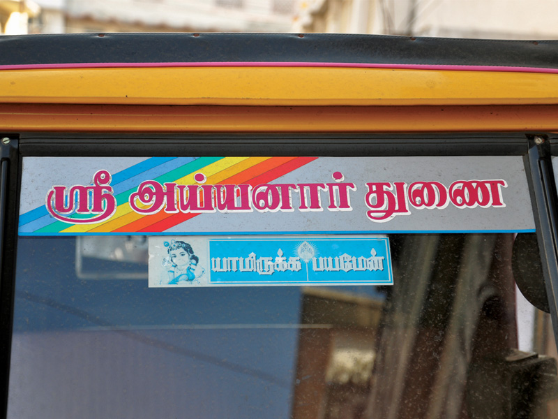 The displayed examples depict various kinds of Sticker Art that explore different typographic styles, colours, forms and expressions of Tamil language in the information displays on the autoricks of Chennai. These stickers exhibit letterforms in stripes, blocks, multiple colours, letterforms juxtaposed with various political, religious and personalized symbols. These vivid coloured sticker letters are available as simple forms or are sometimes hand-cut from reflective adhesive material (generally used material being Radium Vinyl, since it reflects the light. The themes presented are mostly names of the autorick owner, Gods and Goddesses, politicians, film stars etc. The most inviting aspect of Typography here are the expressive letterforms, coloured dimensional stripes and geometric patterns endowing the letters with curious dimensionality and illusion.