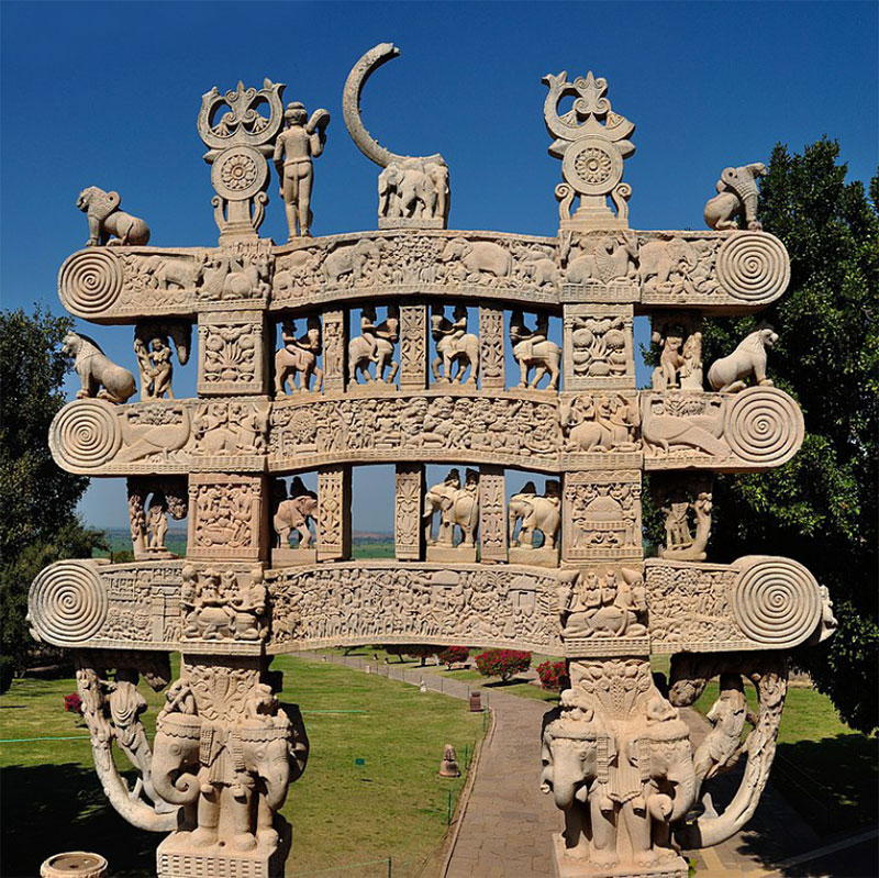 The Sanchi Stupa Buddhist complex in the town of Sanchi (State of Madhya Pradesh, India). The Great Stupa is one of the oldest stone structures in India and was originally commissioned by the emperor Ashoka in the 3rd century BCE. Top Right: Carved decoration of the Northern gateway (torana) to the Great Stupa of Sanchi. Bottom: Close up of one of the panels of the southern torana of the Great Stupa showing King Ashoka visiting Ramagrama to take relics of the Buddha from the Nagas.