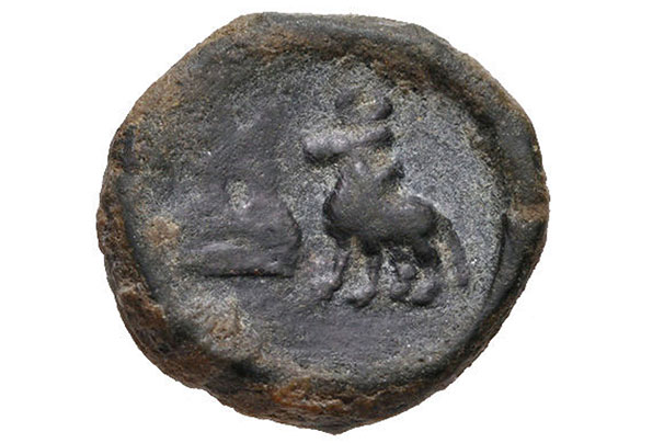 Indian coin of Apollodotus I, with a nandipada taurine symbol on the hump of the zebu bull.
