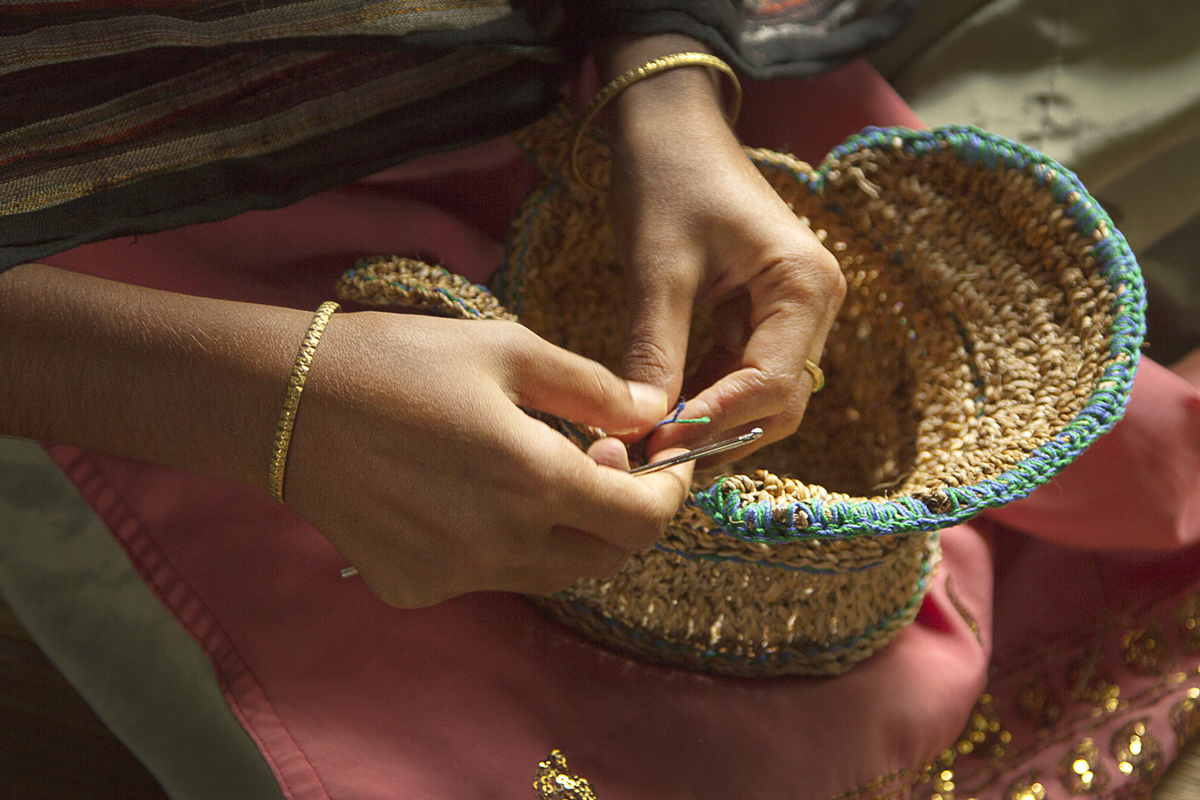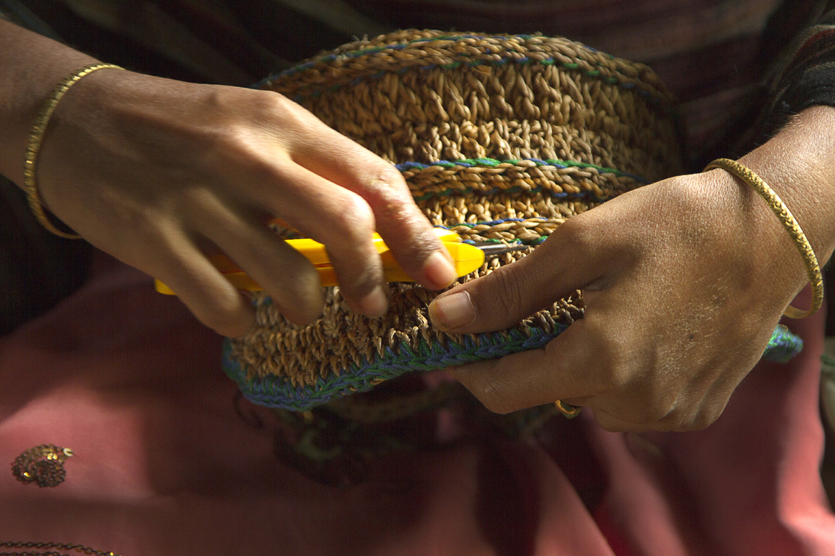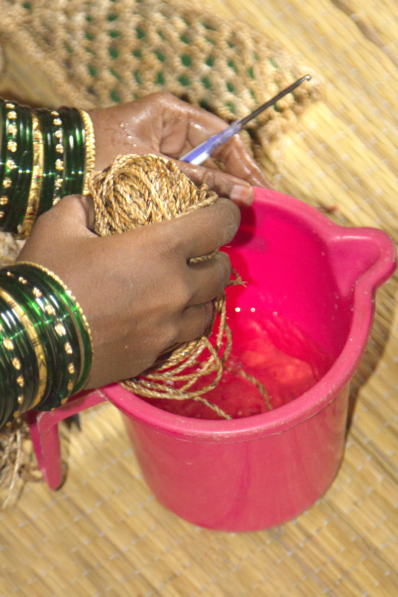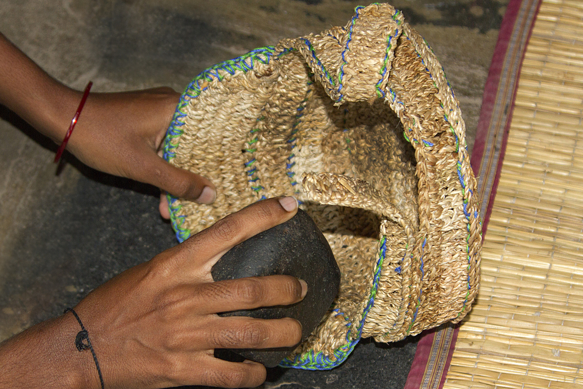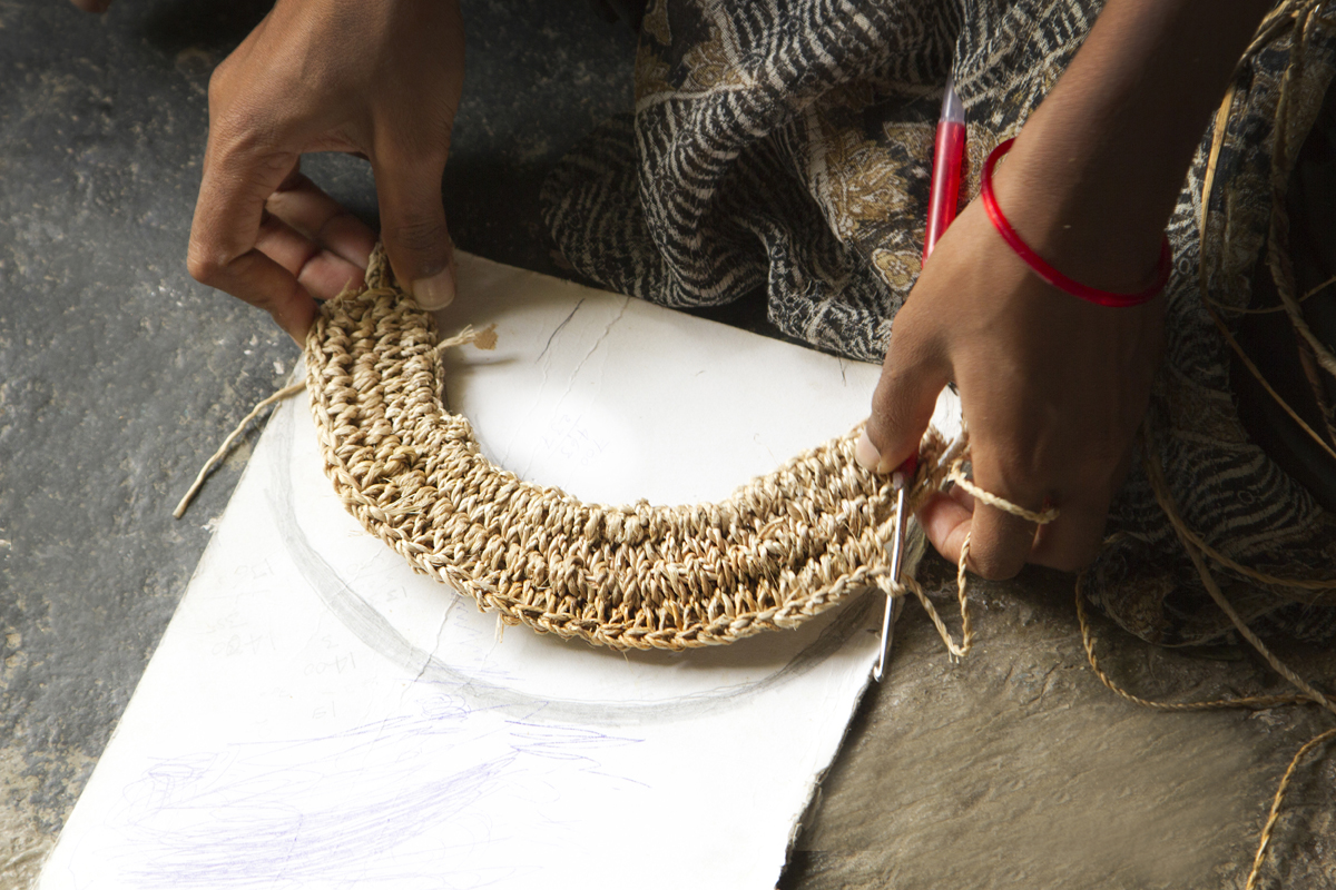 Banana fiber hat is also done in same method of knitting, in this, knitting is done over the fiber rope itself, reference of a hat is taken to measure the size and refer the design. The front part, which gives shade is completed first, and is measured by keeping it on a drawn outline which is a curved path, after which headband and top portion is started which ends with adjustable strap at backside of the cap. It is also measured constantly while knitting, to maintain the form and size required. The fiber is also continuously watered while knitting, so that it can be handled well. It is then lightly beaten with stone in interior section to flatten out any sharp edges to make it skin friendly and wearable.