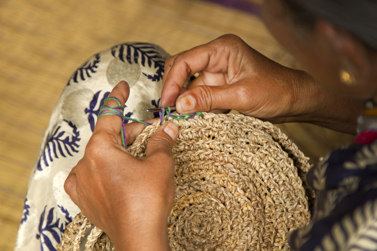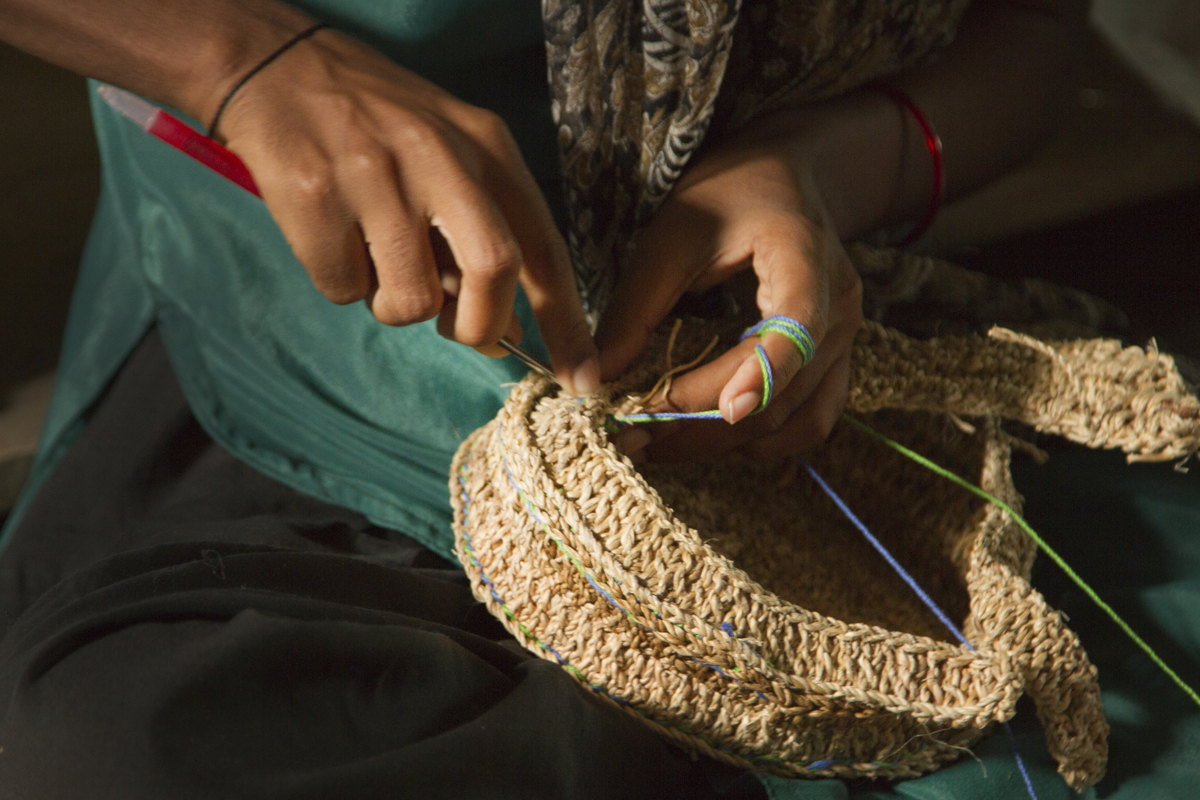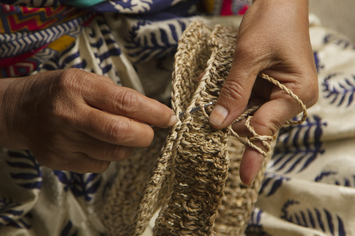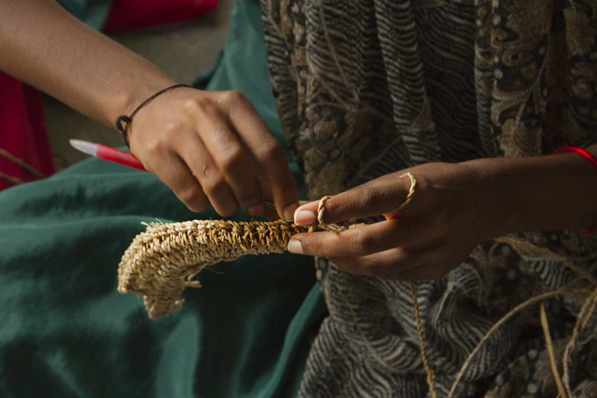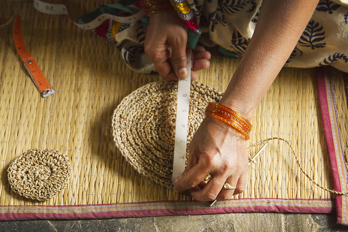 Banana fiber hat is also done in same method of knitting, in this, knitting is done over the fiber rope itself, reference of a hat is taken to measure the size and refer the design. The front part, which gives shade is completed first, and is measured by keeping it on a drawn outline which is a curved path, after which headband and top portion is started which ends with adjustable strap at backside of the cap. It is also measured constantly while knitting, to maintain the form and size required. The fiber is also continuously watered while knitting, so that it can be handled well. It is then lightly beaten with stone in interior section to flatten out any sharp edges to make it skin friendly and wearable.