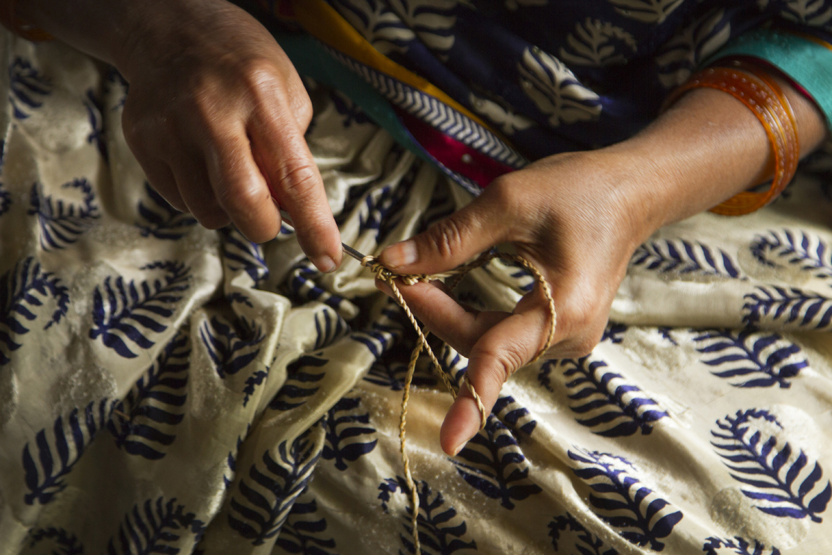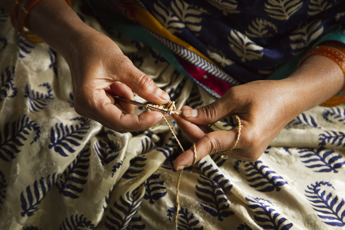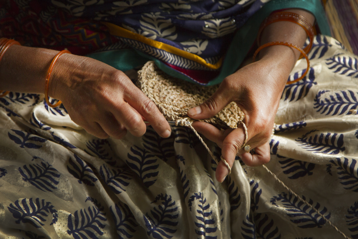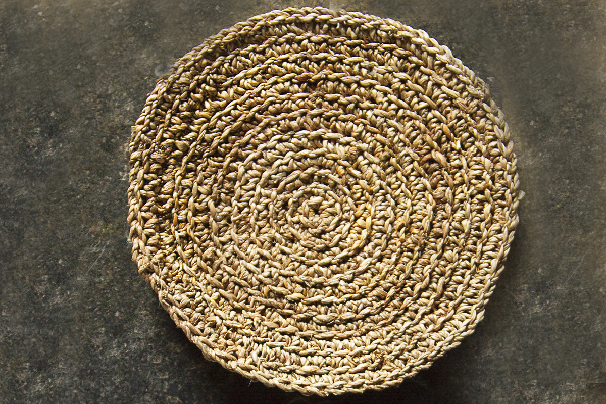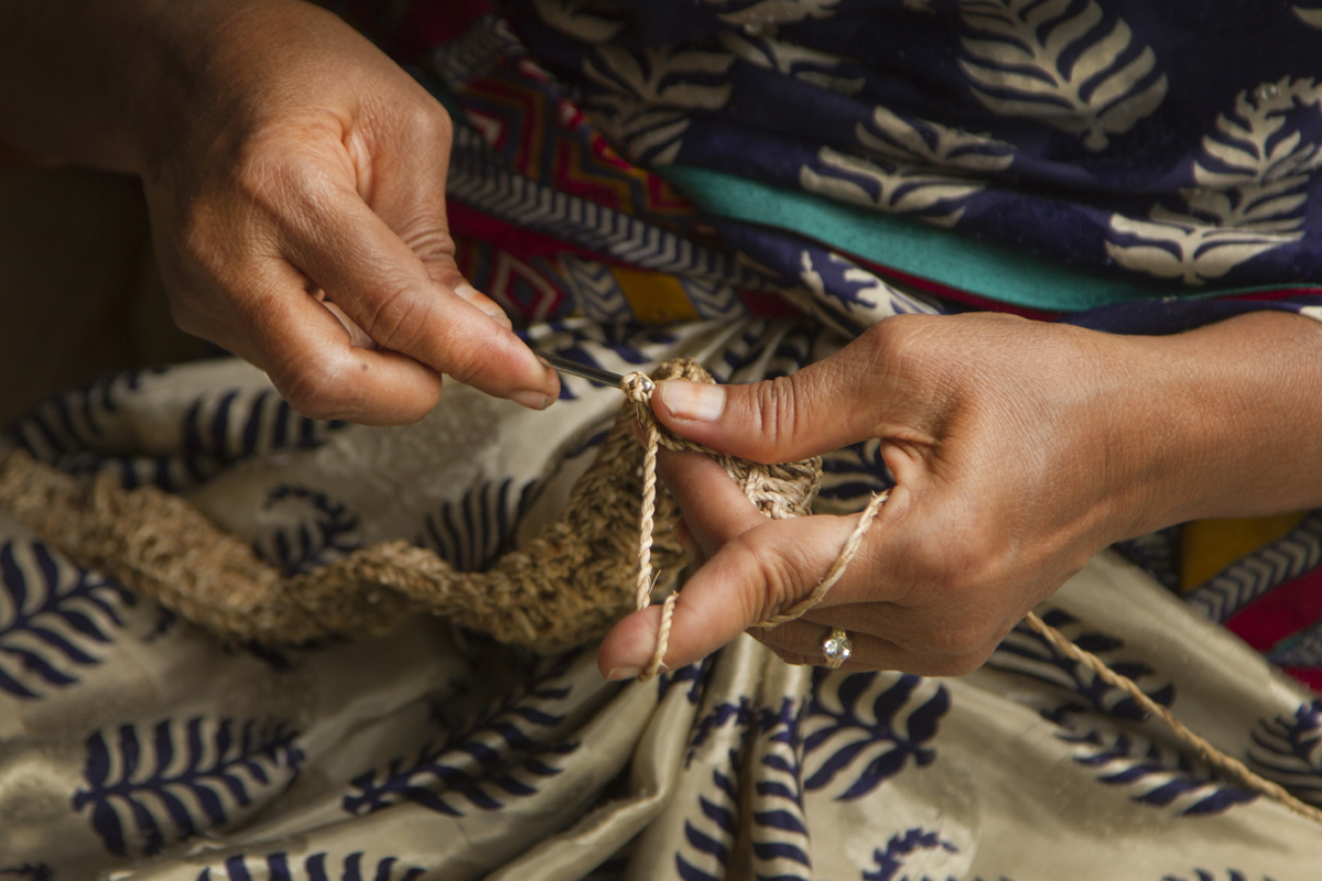 Banana fiber hat is also done in same method of knitting, in this, knitting is done over the fiber rope itself, reference of a hat is taken to measure the size and refer the design. The front part, which gives shade is completed first, and is measured by keeping it on a drawn outline which is a curved path, after which headband and top portion is started which ends with adjustable strap at backside of the cap. It is also measured constantly while knitting, to maintain the form and size required. The fiber is also continuously watered while knitting, so that it can be handled well. It is then lightly beaten with stone in interior section to flatten out any sharp edges to make it skin friendly and wearable.