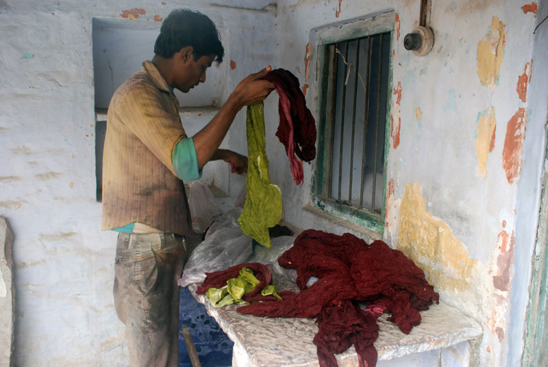 There are different stencils for different patterns. For example, stencils for neck, sleeves and for overalls. Washable inks like geru, Earth red, and neel, Indigo blue are used for marking.