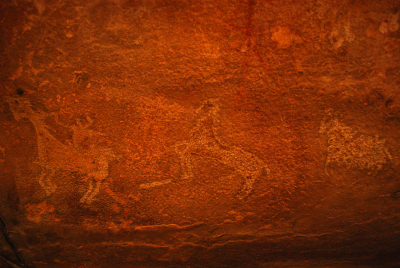 Paintings of both red and white colors are found in this shelter. Illustrations of warriors, horse riders, animals and various rituals can be seen. Superimposition of paintings makes this cave an important landmark in the map of Bhimbetka.