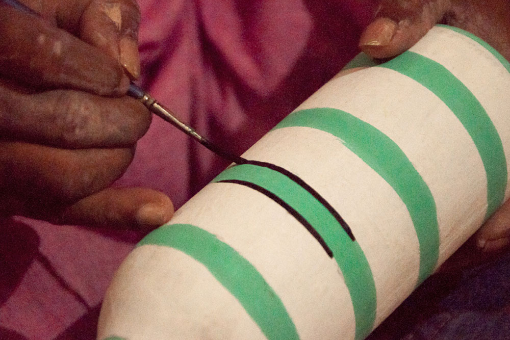 Warli Earthen Pot Painting/ Flower Vase Painting or bottle painting are one of the very simple art performed and are followed by the artisans of Raghurajpur. A plain Flower Vase or an empty bottle is bought in use (bottles are been washed cleanly and check if any dust particles exist) for this art to be performed upon, smooth surface turns to rough surface with the help of sandpaper. Cloth is applied on the bottle with the help of homemade glue which in turn, creates canvas base. Bottle is painted with the help of white base cote, it’s left for drying under the sun for about an hour. Brown or white paint is applied as background over its surface with a thick paint brush. Choosing a design from either mind or from the customer’s order, artesian starts creating a rough line drawing with the help of pencil. Drawing is made on the tracing paper where all the elements are added, artesian traces the design on bottle using carbon sheet.