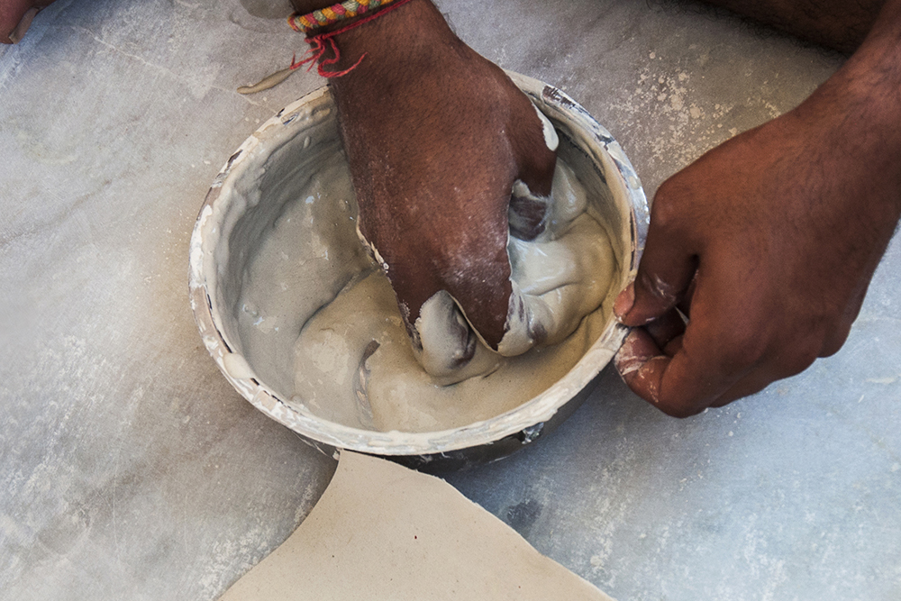 The cloth on which the process has to be done is of khadi cotton material. A mixture of suddha matti (White Mud), rice starch, boiled tamarind seed paste and natural tree gum is mixed in proportion and is made into a slurry kind of paste. The color of this mixture is off white and it is evenly applied with bare hands on the khadi cotton cloth. This process is repeated for three times for each piece of cloth. At every single application the consistency of slurry is made thinner by adding more tree gum into it. After the application of three coats on the khadi cloth piece, it is allowed to dry naturally under the sun and is ready to be used for painting.