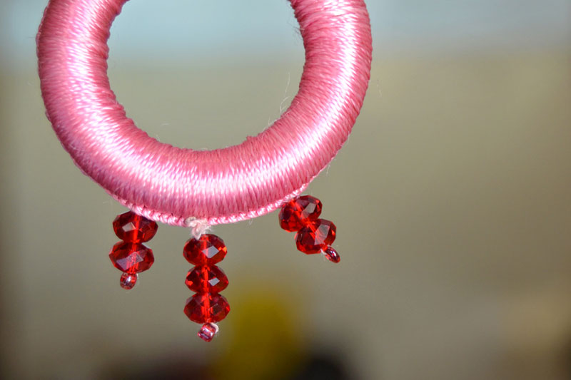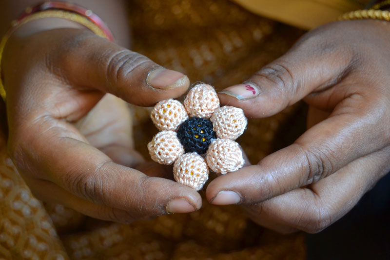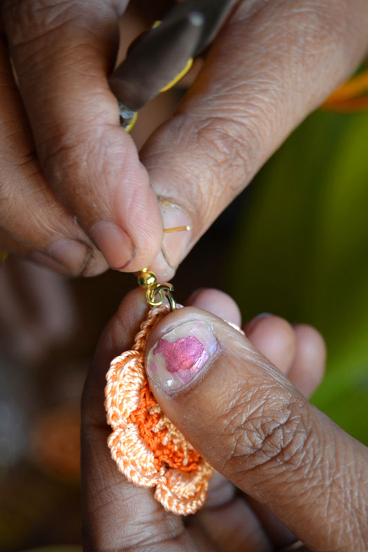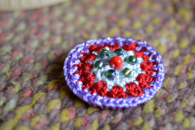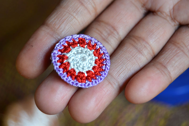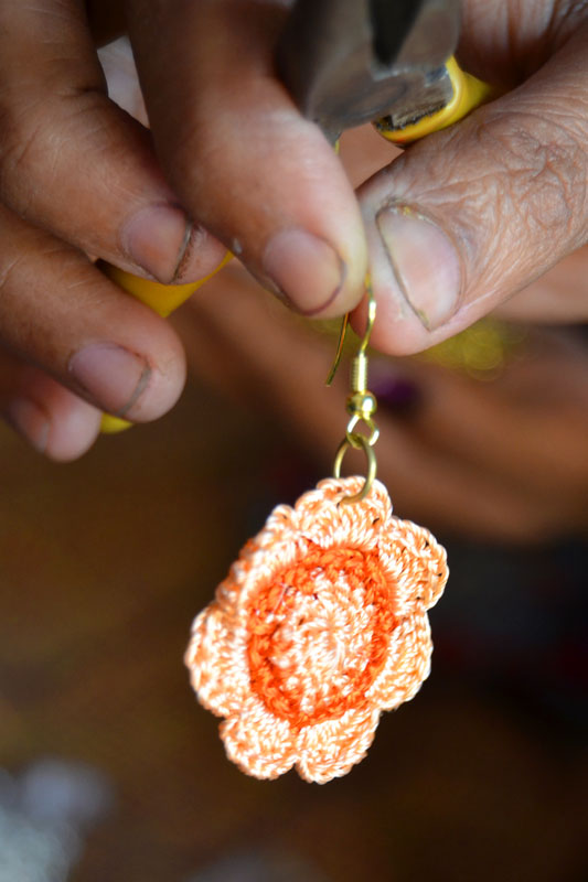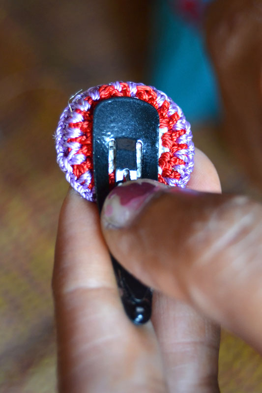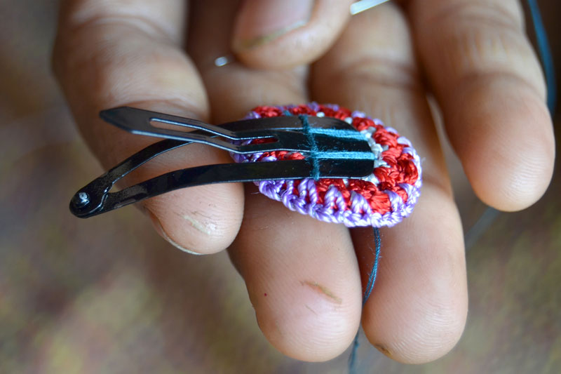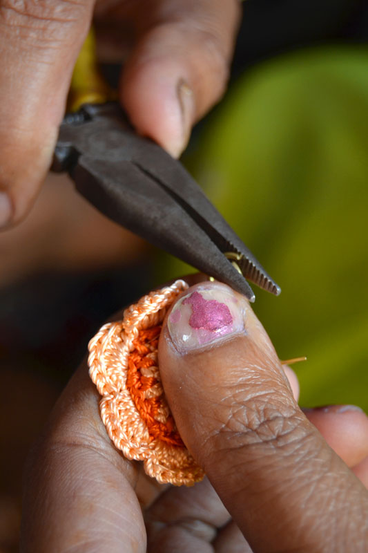 The crocheted piece is ‘finished’ by closing the loose end of the working thread into the pattern and trimming extra ones (if any). Other tasks include attaching metallic earring loops, hair-pins, wooden jooda pins etc. to the chakris and flowers to complete the product.Simple crochet jewelry pieces can be made more interesting by introducing decorative materials like colored beads, sequins, charms, danglers etc.