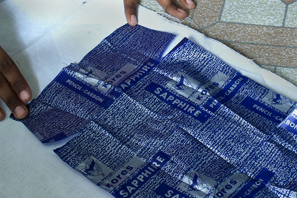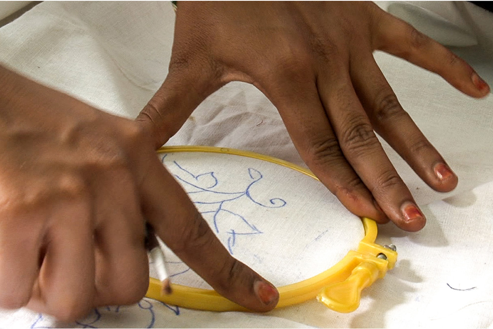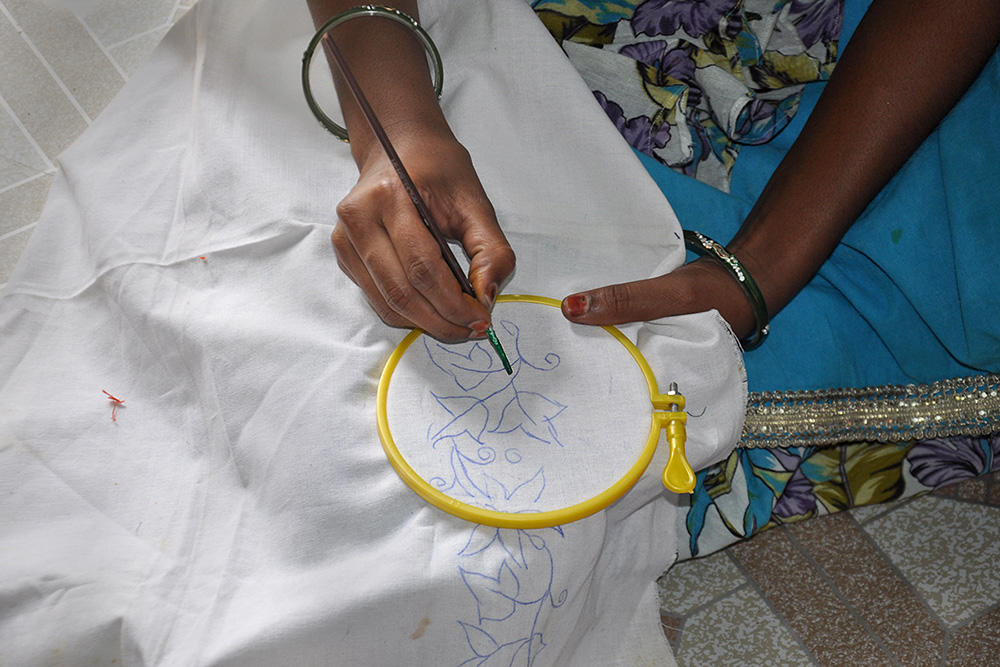 The painting is done on a piece of cloth whose size depends on the design being painted or the type of garment to be made out of it. Initially, the artisan measures a required size of cloth and places a carbon paper on it. This is to trace the indented design to the fabric. Then a sheet carrying various floral designs is kept over the carbon paper and the design is drawn with a pencil. Once the drawing is done, both the sheets are removed and the fabric is attached to an embroidery hoop to start painting. Using a small-sized paintbrush and acrylic fabric colours, the artisan then starts with the periphery of the sketch. Here the colours are transferred to a pallet for easy access to multiple colours at a time. Fabrics paints are a type exclusively manufactured for textiles products. After completing around the periphery, they progress to the interiors of the design to fill in the remaining area. Once the paint dries the fabric can be framed or used to stitch different kinds of garments.