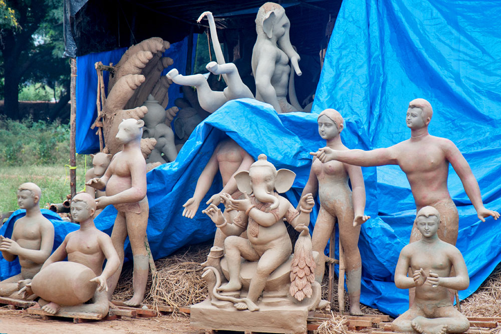 The idol is sculpted out of mud taken from nearby one's home. After the festival, it was returned back to the Earth by immersing it in a nearby water body. This cycle was meant to represent the cycle of creation and dissolution in Nature.