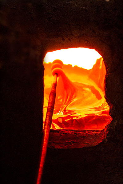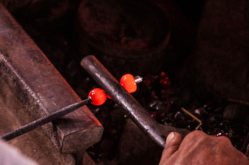 Glass beads are also produced on a major scale using the Open furnace method. The basic process of melting and molding is same for the both the bead making technique. During this method large blocks of glass are placed in the furnace which are melted, to be looped around an iron rod or Sariya, with the help of different tools like Trowel, file are used to mold the molten glass into different shapes like cylindrical, circular and flat shaped beads.
